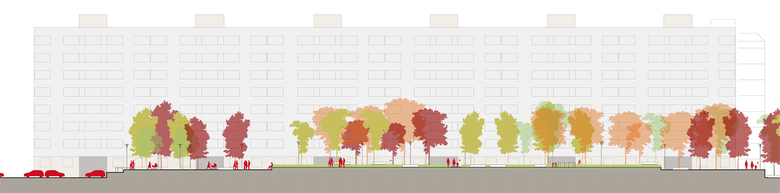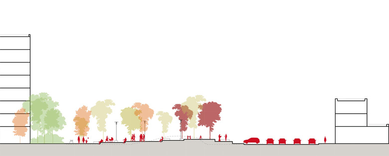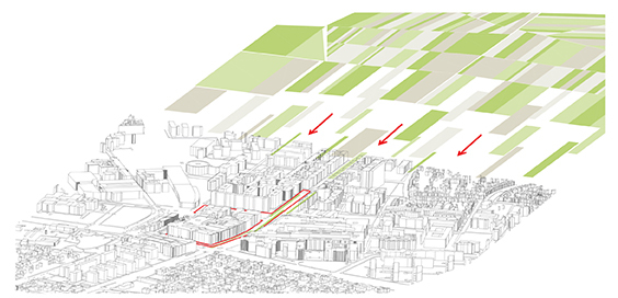 The parterres disposition harmonizes with the structure of the viennese valley agricultural fields, strengthening the Wargramer urban axis as a new centre for social and commercial activities in Kagran.