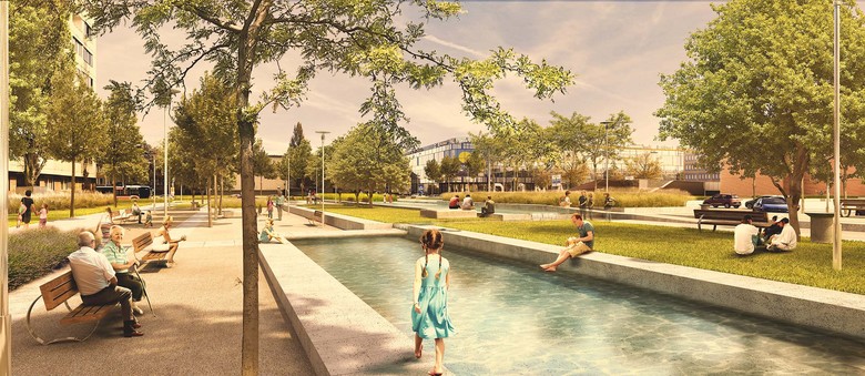 In Czernetzplatz the existing topography is modified by 50 cm high terraces, that create quite playing areas and water mirrors that use the difference in height.