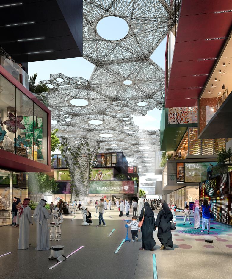 Das Zentrum verankert insgesamt drei miteinander verbundene Bezirke, in welchen alle relevanten Haupteinrichtungen und touristische Attraktionen angesiedelt sind: Das „FORUM“ des Clusters stellt mit Hauptsitz der MiSK-Stiftung samt Konferenzzentrum, einem Museum für Wissenschaft und einer Akademie das Zentrum für Bildung dar. Der „IMMERSIVE DISTRICT“ bietet einzigartige Erlebnisse verschiedener Kulturinstitutionen und dem Einzelhandel. Die LIFELINE ist die Hauptader, gestaltet als erlebbare Verbindung, die flexible Arbeitsplätze, Wohn- und öffentliche Einrichtungen sowie Kulturprogramme an einem Ort vereint. Jeder Bezirk zeichnet sich durch eine individuelle, ablesbare Architektur aus, die identitätsstiftend ist.