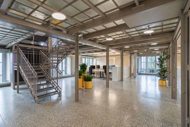 Die Gestelle wurden rückgebaut und die thermische Isolation vor den historischen Fenstern sowie die Kanäle der Klimatisierung entfernt. Die Bodenöffnungen unter den Gestellen mussten geschlossen werden, um genügend Fläche für die Arbeitsplätze zu generieren. Um den geringen Raumhöhen von 230cm entgegenzuwirken, wurden in vier Deckenfelder Galerien eingebaut.
