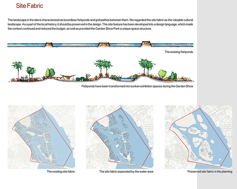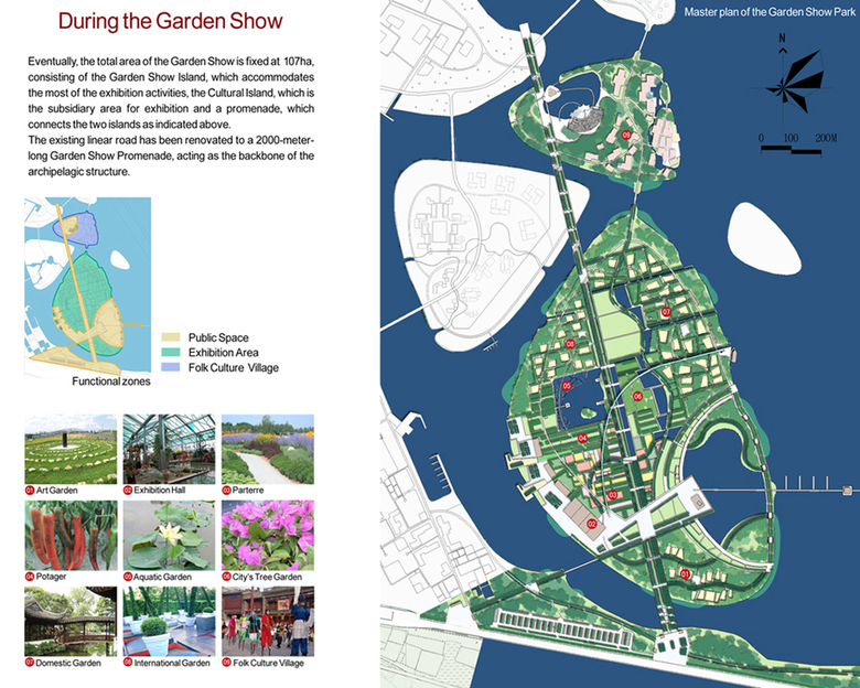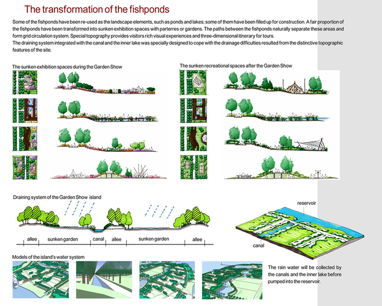 The garden show is held in Garden Show Island, with Cultural Island as an assistant exhibition area. The existing landscape of Garden Show Island is characterized as boundless fishponds. This site feature has been developed into a design language, which makes the context continued and reduces the budget, as well as brings about a unique space structure. Some of the fishponds have been re-used as the landscape elements, such as ponds and lakes; some of them have been filled up for construction. A fair proportion of the fishponds have been transformed into sunken exhibition spaces with parterres or gardens. Each fishpond is a separate exhibition space. The paths between the fishponds naturally separate these areas and form grid circulation system. Special terrain provides visitors rich visual experiences and three-dimensional itinerary for tours. The existing linear road has been renovated to a 2000-meter-long Garden Show Promenade, acting as the backbone of the archipelagic structure. Other spaces and facilities, such as garden show plaza, show areas, exhibition halls, amphitheatre, café area and a footbridge, have been laid out too. Replacing the exhibition gardens and flowers with trees and lawns after the festival, the Garden Show Park will be transformed into a central park of the New Town, providing recreational places for people.