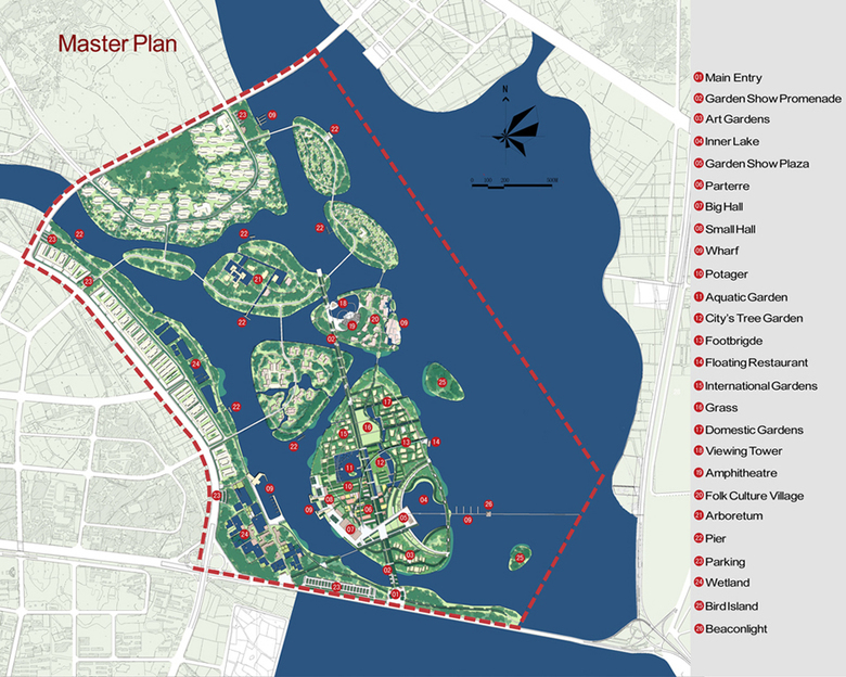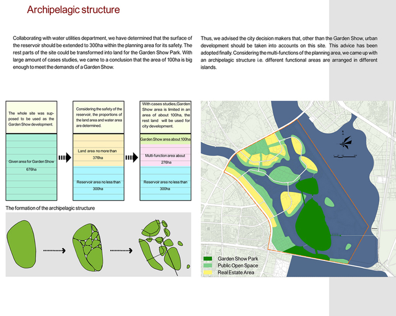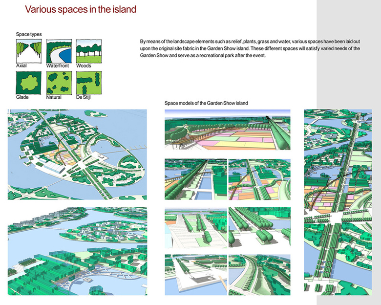 Nine islands, one peninsula and one waterfront area have been laid out on the site. Two islands are used for garden show, another two small ones for ecological bird habitats and one island as an arboretum for the nearby university. The rest of the islands and land area are reserved for urban development. The waterfront is developed into a public open space system, acting as the regional green infrastructure. As a matter of fact, this decentralized green space is much more accessible and effective than a large green space.