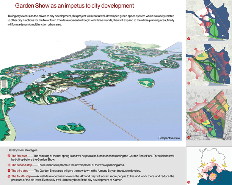 Considering the multi-functions of the planning area, we came up with an archipelagic structure, i.e. different functional areas are arranged in different islands. This distinctive structure is a metaphor of the geographical features of Xiamen and good both for flood control and being implemented step by step. It also provides a large number of waterfront spaces.