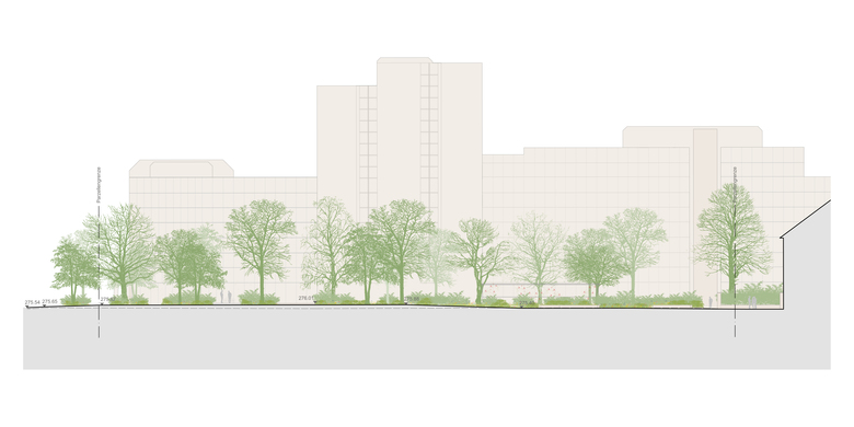 Der Aussenraum des heutigen Hauptsitzes der Baloise Versicherung (APA) nördlich des Parkwegs besitzt eine hochwertige Gestaltung. Dieser Aussenraum wird, wie auch der Parkweg, zu einem Teil des neuen Platzgefüges. Gleichzeitig erfolgt eine Anbindung an den geplanten Boulevard Aeschengraben. Der parkähnliche Charakter um den heutigen Hauptsitz der Baloise mit Baumgruppen in freier Anordnung wird für die Neugestaltung im Aussenraum des Parkweges aufgenommen. Die Hauptelemente der Freiraumgestaltung sind das Platzgefüge, die Stufen und die Grünflächen, die wie grossformatige Baumscheiben gruppiert und mit frei angeordneten Hochstammbäumen und mehrstämmigen Bäumen bepflanzt werden.