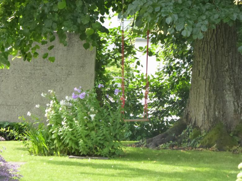 Die raumprägenden Zeitzeugen des ursprünglichen Gartens waren die grosse Linde im Südgarten, die allseitige Einfriedung mit dem Hainbuchen-Lebhag und die Senke im Westgarten. Die ursprünglichen Pflanzungen und Wege waren verändert oder ganz verschwunden. Inspiriert von der Gesamtkonzeption, dem historischen Situationsplan und den vorgefundenen Zeitzeugen im Garten galt es abzuwägen, wieviel rekonstruiert oder neuinterpretiert werden sollte. Die klare räumliche Grundstruktur und die Wegeführung des Gartens waren gut dokumentiert und liessen sich fast originalgetreu rekonstruieren. Wie ursprünglich geschehen, wurde der Garten mit Heckenbändern und Beeten für Schmuckstauden gegliedert, Trittsteinwege verbinden wieder die einzelnen Gartenräume. Hingegen wurde die Bepflanzung des Gartens neuinterpretiert: Zum Beispiel die beiden grosszügigen und ursprünglichen Staudenbeete, die für „Blumen und Gebüsch“ vorgesehen waren. Eines der Beete befindet sich vor dem Wohnzimmer, das andere mittig im Westgarten, welches gekonnt den Niveausprung zum Senkgarten aufnimmt. Eine Mischung aus Sommerblumen, Stauden und niederen Gehölzen schmücken diese Beete.