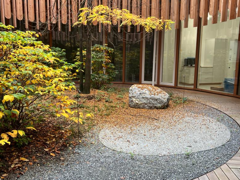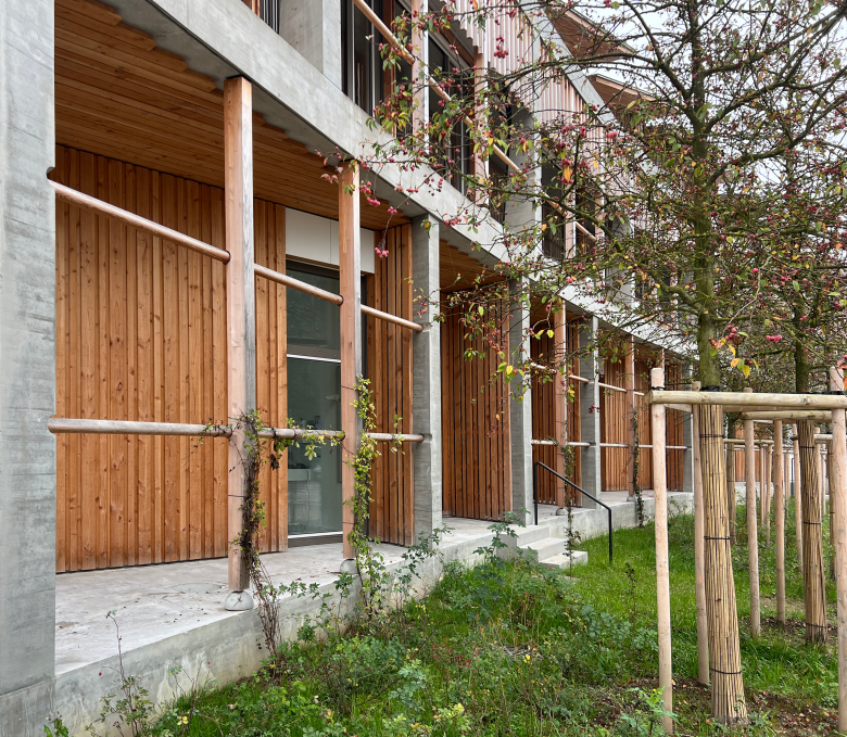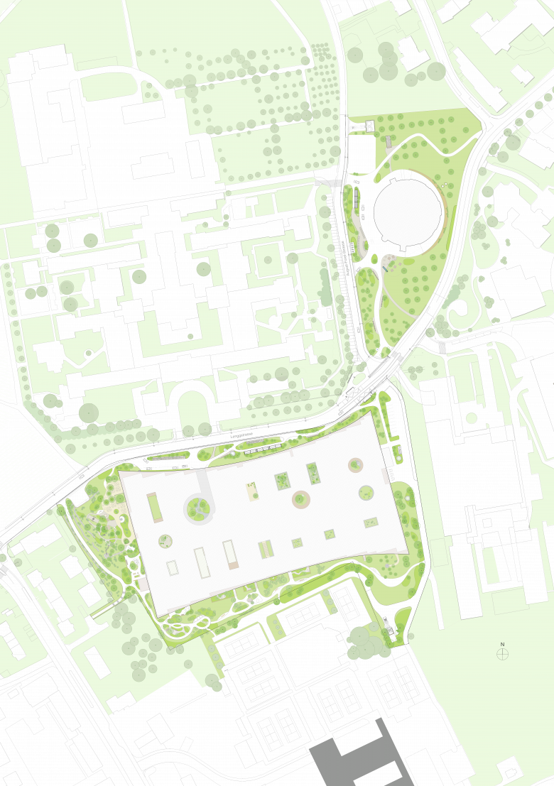 Die Umgebung bindet das neue Kinderspital und das neue Forschungszentrum in den Landschaftsraum Burghölzli ein. Die umliegende Landschaft ist geprägt von parkartigen Gartenteilen, Umgebungen von Spitalbauten aus verschiedenen Epochen sowie von landwirtschaftlich genutztem Kulturland mit Obstwiesen und Weinbaukulturen. Die Vorzone entlang der Lengg- und August Forellstrasse bildet die neue Adresse und verbindet die beiden Haupteingänge. Das runde Forschungszentrum wird von einer Obstwiese umspielt und bettet sich in die natürliche Hanglage der Parzelle ein. Um das neue Kinderspital ensteht eine gestalterisch dichte, kindergerechte Spitalumgebung mit einer Vielfalt an erlebbaren Garten-, Park- und Landschaftsräumen. Durch das flächige Volumen des Spitalneubaus werden die Höfe zu wichtigen Gartenräumen. Sie bringen als ‚grüne Zimmer‘ die Natur ins Gebäude und schaffen Geborgenheit und Orientierung. Die geschwungene Wegeführung mit einem Baumhain aus Zieräpfeln und langgezogenen Sitzbänken schafft einen öffentlichen Freiraum mit Promenadencharakter und Aufenthaltsqualität.