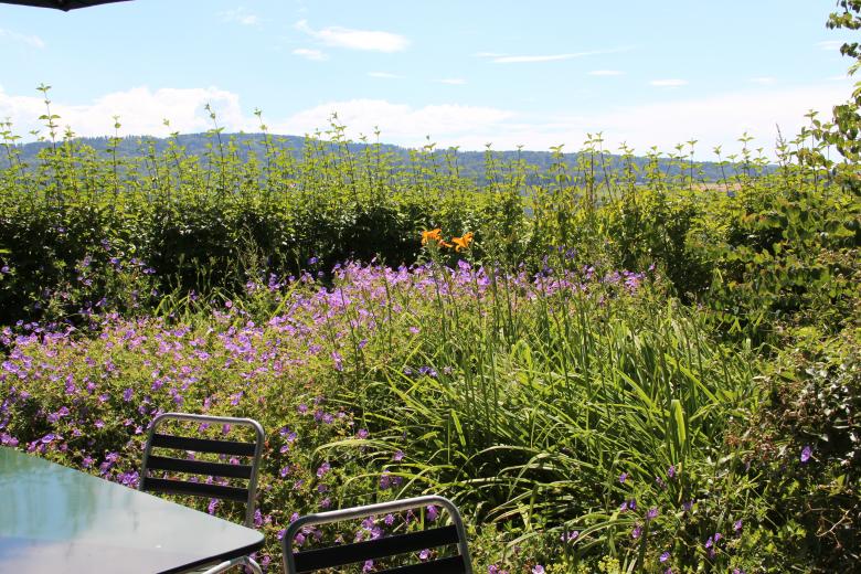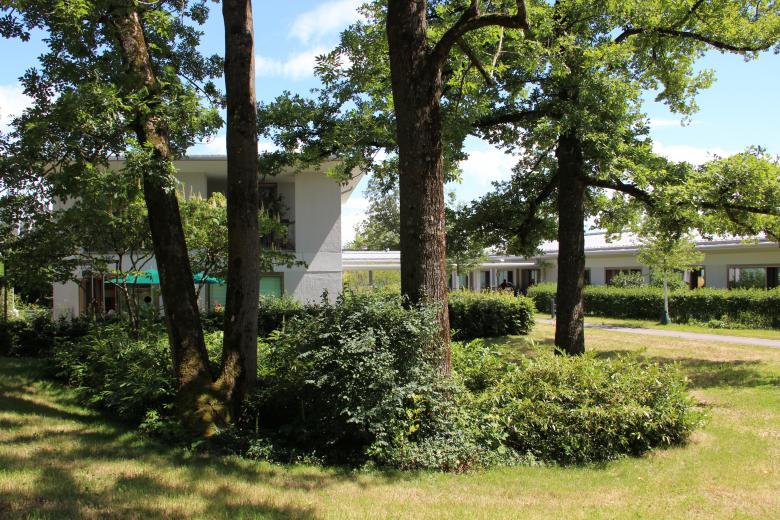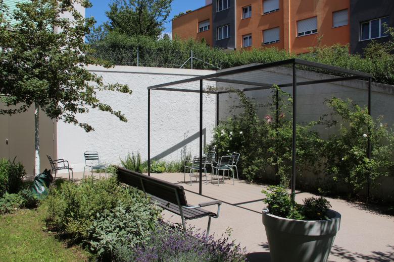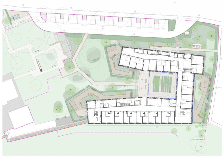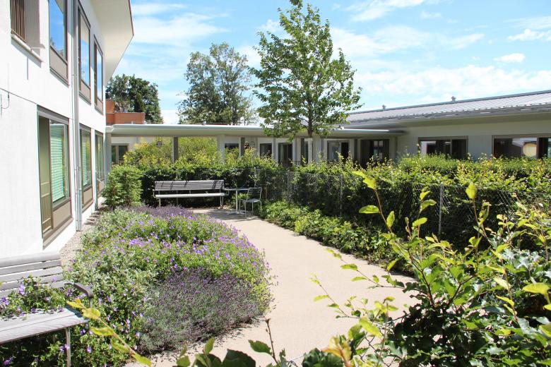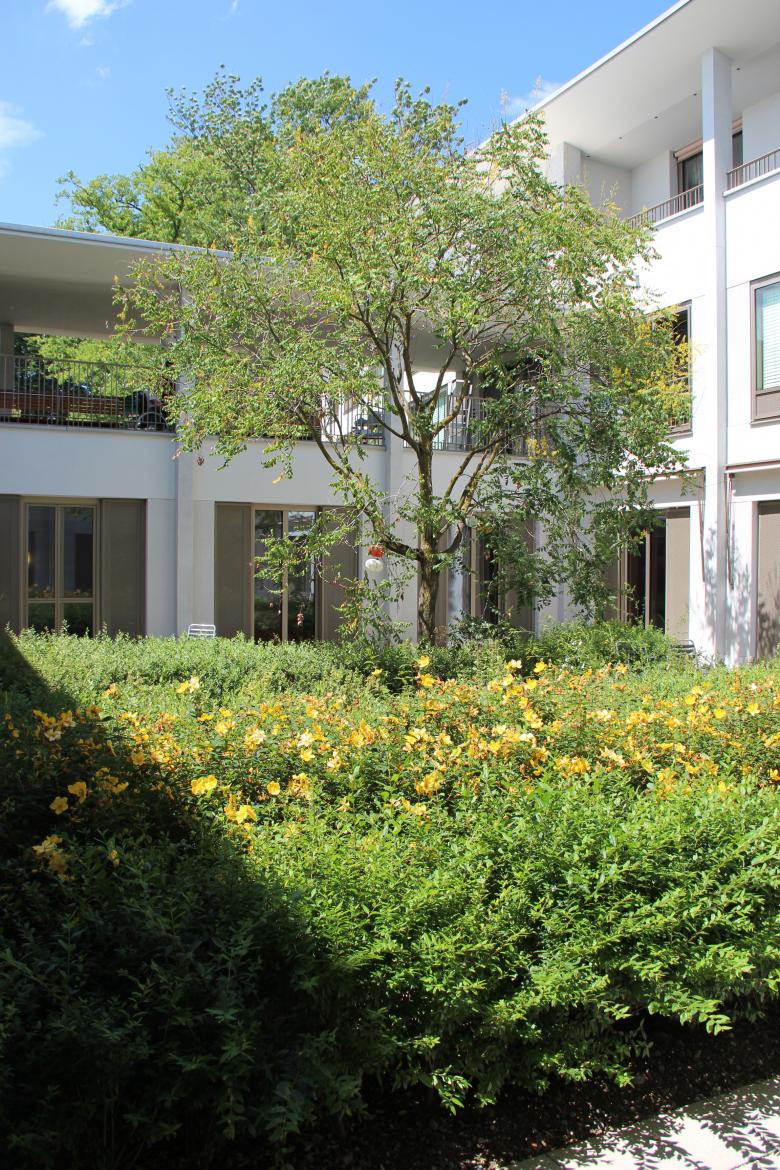 Der Neubau Haus B des Pflegezentrum Bombach ist auf die spezifische Betreuung von demenzerkrankten Menschen zugeschnitten. Dies hat direkte Auswirkungen auf die Gestaltung der Häuser und die Umgebung. Das räumlich-atmosphärische Wohlbefinden spielt eine zentrale Rolle. Die bestehende, grosszügige Parkanlage mit dem ausgewachsenen Baumbestand ist von der Limmattalstrasse aus gesehen ein prägendes Element. Diese wertvolle Substanz bleibt, wo möglich, erhalten und wird mit neuen Parkbäumen, Gehölzpflanzungen, Stauden und Zwiebelpflanzungen ergänzt und bis zum Neubau fortgeführt. Zudem bekommt jede Station vom Neubau einen in sich abgeschlossenen Garten. Die Gärten bieten den demenzerkrankten Menschen die Möglichkeit, sich in einer geschützten Umgebung zu bewegen. Blütensträucher, Obstbäume und verschiedene Staudenrabatten vermitteln den BewohnerInnen vertraute Bilder, die mit positiven Erinnerungen verbunden sind. Die Wegflächen der Stationsgärten sind aus Honigasphalt einem warmen Braunton ausgebildet. Das Parkwegsystem bestehen aus Asphaltbelag, gefasst durch einen Bundsteinabschluss.