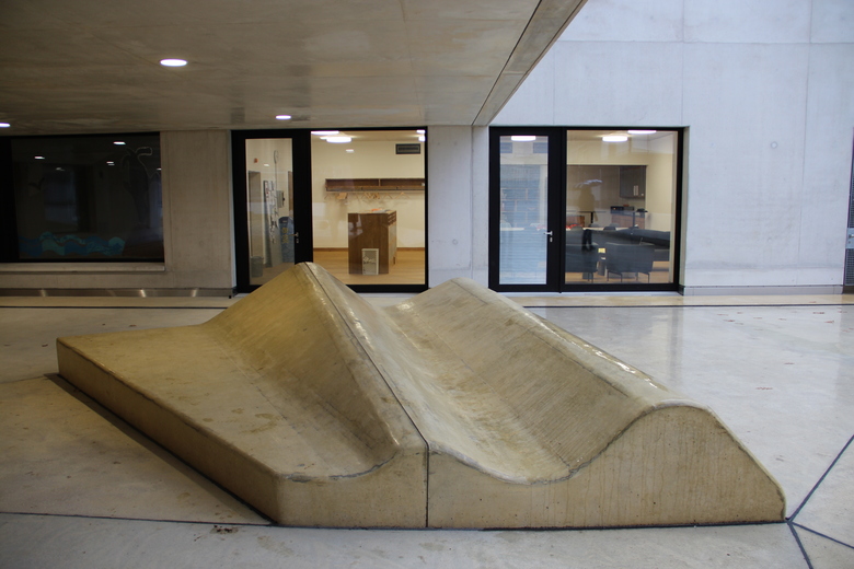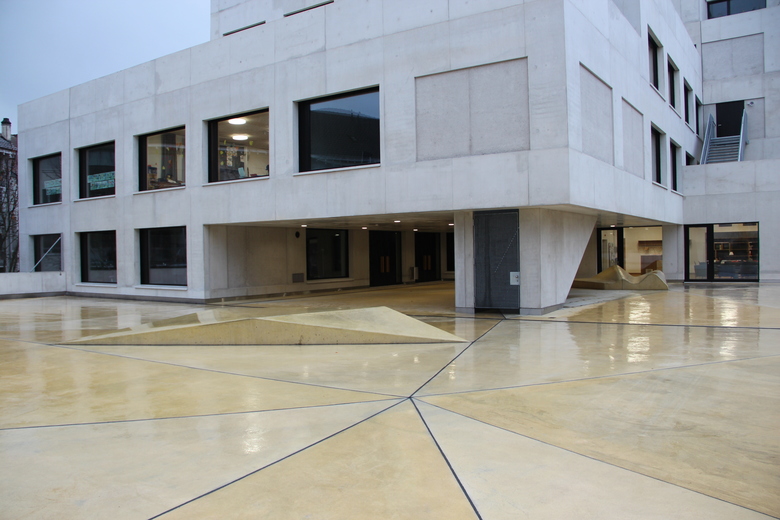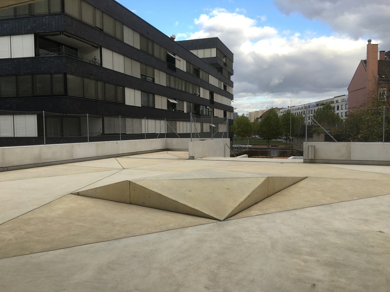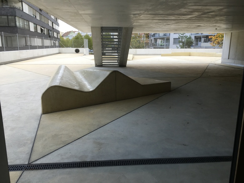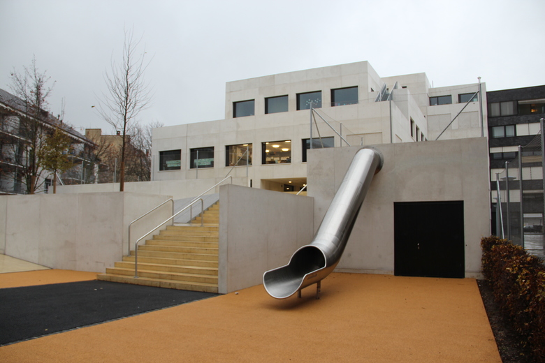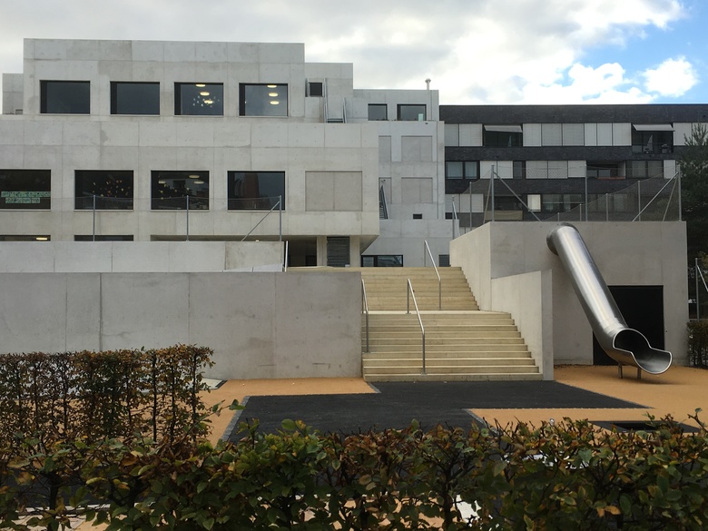 Durch eine grosszügige Treppenanlage ist der Schulhof mit der Dachterrasse des Hauptgeschosses, dem gedeckten Pausenhof-Bereich verbunden. Verschiedene Betonskulpturen strukturieren auf leichte Art die Hauptterrasse und regen zusammen mit den unterschiedlich geneigten Oberflächen den Bewegungssinn an.