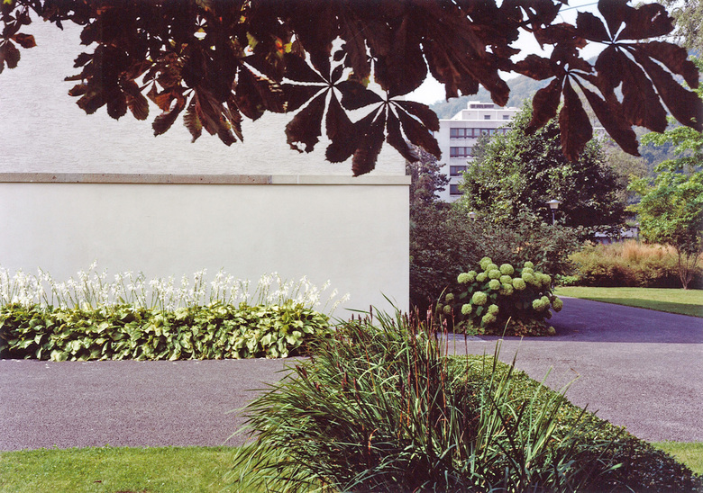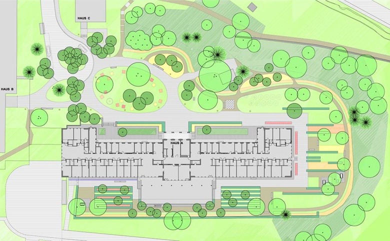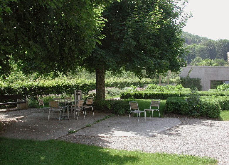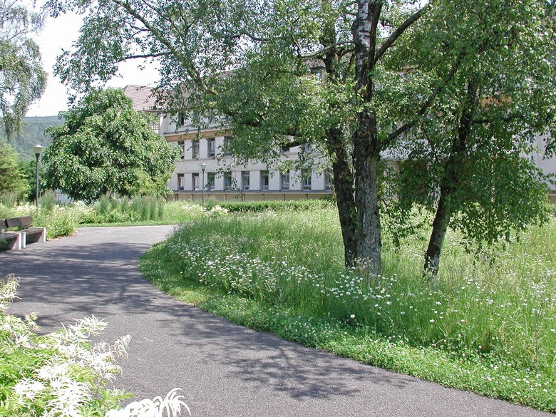 Die alte geometrische Gartenanlage weist eine Gestaltung auf, wie sie zu Beginn des 20. Jahrhunderts bei psychiatrischen Kliniken sehr häufig vorkam. Die noch bestehenden Strukturen wie auch der alte, schöne Baumbestand bildeten die Grundlage für die neue Umgebungsgestaltung. Dabei besteht das Konzept einerseits aus den auf das Haus ausgerichteten, formal streng angelegten Gartenräumen, andererseits aus einem Spazierweg durch eine Abfolge differenzierter Grünräume, die in die angrenzende Landschaft überleiten.