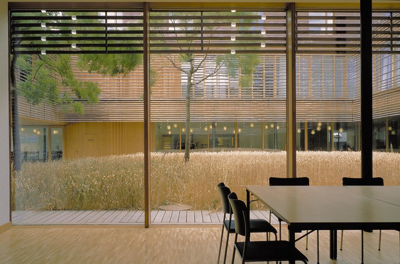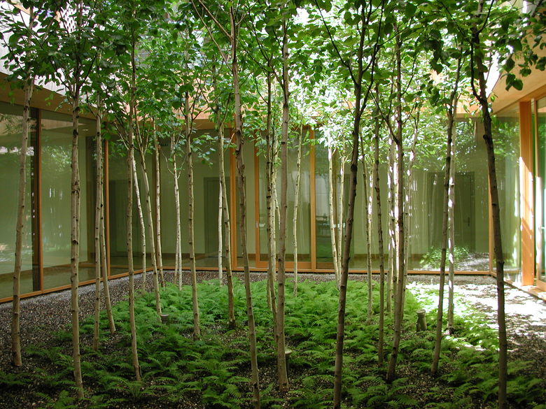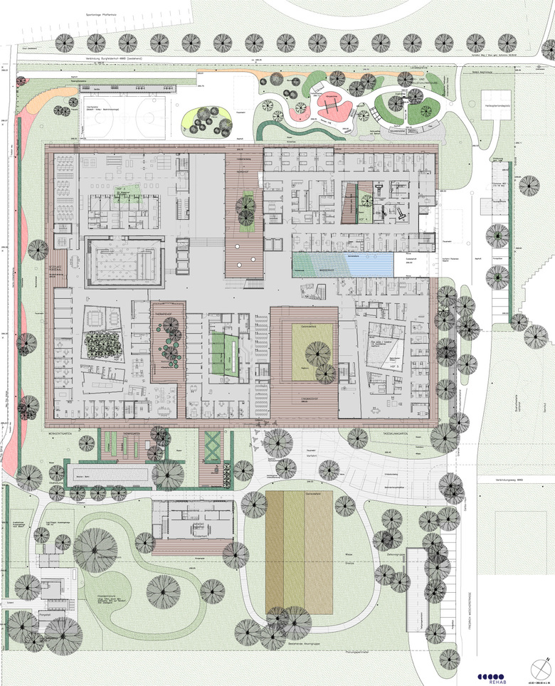 Die Gestaltung der Umgebung und der Innenhöfe ist integraler Bestandteil des neuen Rehabilitationszentrums in Basel. Architekten und Landschaftsarchitekten haben gemeinsam ein Konzept entwickelt, das im Wesentlichen zwei Hauptziele verfolgt. Erstens sollen unterschiedliche Naturräumen geschaffen werden, die eine Vielfalt von sinnlichen Erlebnissen erzeugen sowie der Orientierung im Gebäude dienen. Zweitens soll die Landschaftsgestaltung Grenzen überschreiten und Verbindungen herstellen: Zwischen Innen- und Aussenraum sowie zwischen den Parzellen. Dazu greift die Umgebungsgestaltun die Elemente der vorhandenen Kulturlandschaft auf und führt sie weiter. Den Kontrast dazu bilden künstliche Formen von Natur: Wasserbecken, Kiesgärten, aus Holzdecks wachsende Bäume sowie Topfpflanzen erzeugen eine spannungsreiche Ergänzung zu den landschaftsnahen Elementen. Das Gebäudedach ist als intensiv bepflanzte Dachgartenlandschaft ausgebildet und ist mehrheitlich begehbar.