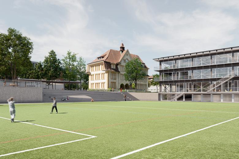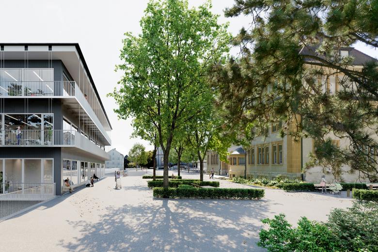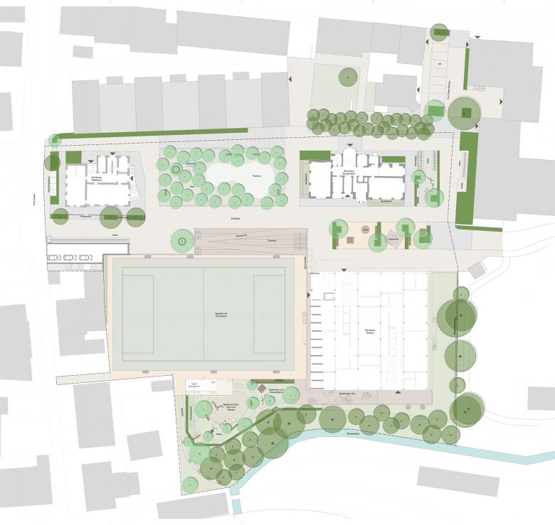 Durch die Setzung des Schulhaus Neubaus im Nordosten des Perimeters entstehen zwischen den drei Schulgebäuden neue, unterschiedliche Freiräume.