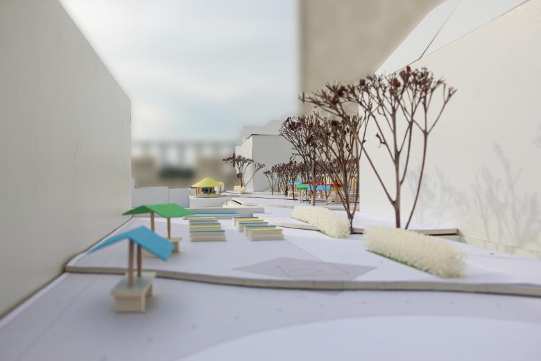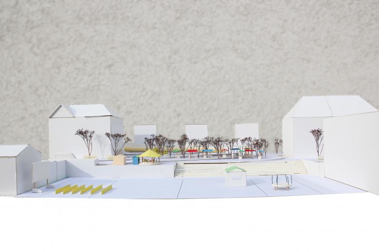 Die vorhandene Topographie wird respektiert und öffnet für alle Schulhäuser unterschiedliche Weitsichten ins Leimental. Der bestehende Niveausprung wird gestärkt und die beiden Terrassen sind mittels einer Sitztribüne mit Treppe und Rampe verbunden.