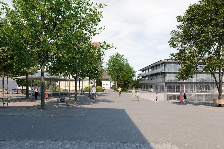 Die bestehenden Bäume sollen weitgehend erhalten bleiben und werden auf dem Freiraum zwischen den beiden bestehenden Schulhäusern mit einem Baumhain aus mittelkronigen Laubbäumen, einem vielseitig nutzbaren Pavillon und Dorfbrunnen ergänzt. Dieses Konzept bindet die Gemeindeverwaltung, die bestehenden Schulhäuser und den bestehenden Baumhain vor der Migros ein und bildet zusammen mit dem neuen Dorfplatz ein lebendiges Zentrum. Die wassergebundene Decke unter dem neuen Baumhain zeichnet den Pausen- und Dorfplatzbereich aus und bietet vielfältige Aufenthalts- und Spielmöglichkeiten.