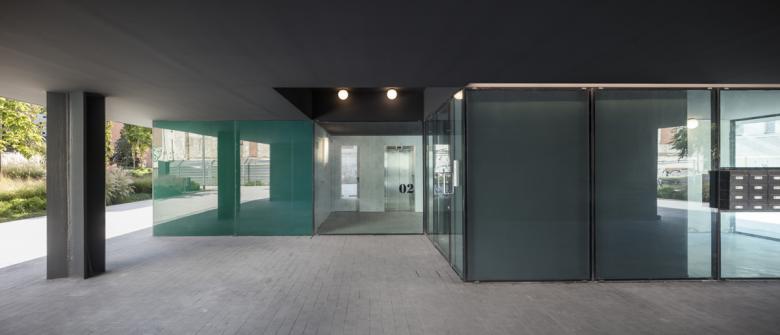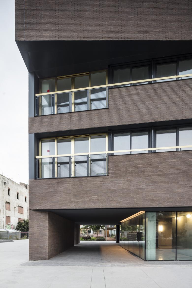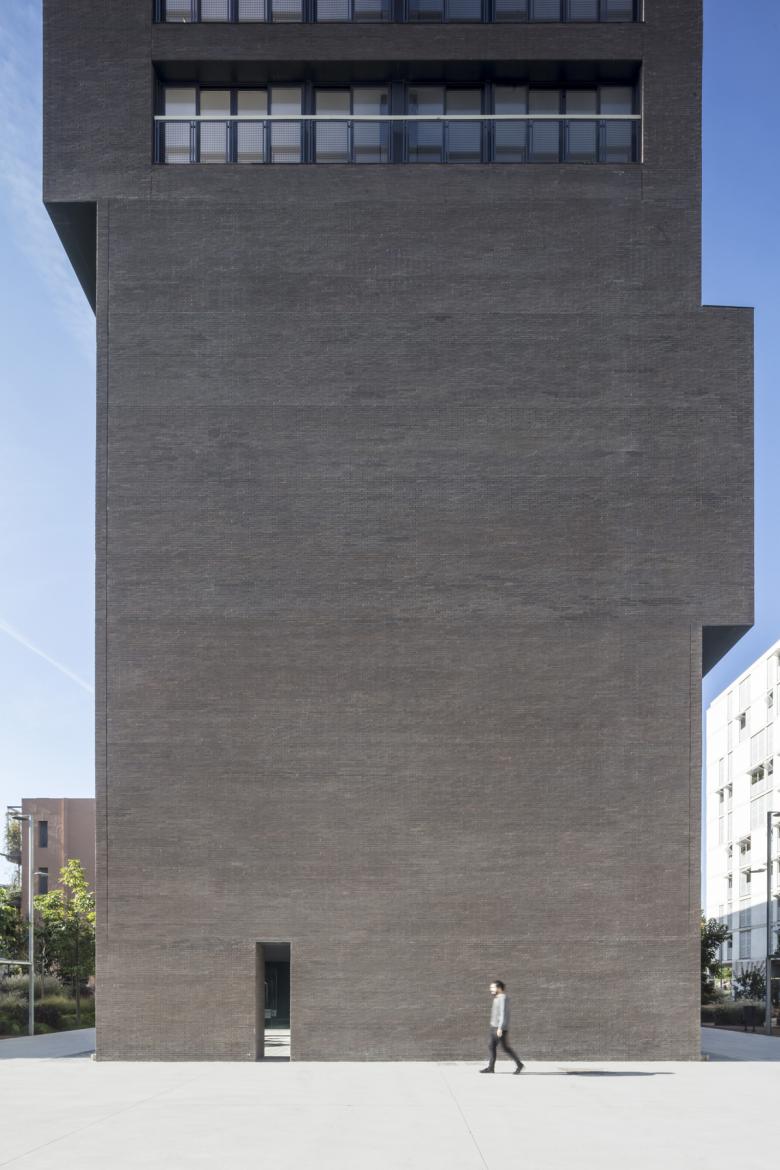 It is built of black brick, which contrasts with the building?s technological surroundings, and has long windows that give the apartments plenty of light and exceptional views for such small spaces.