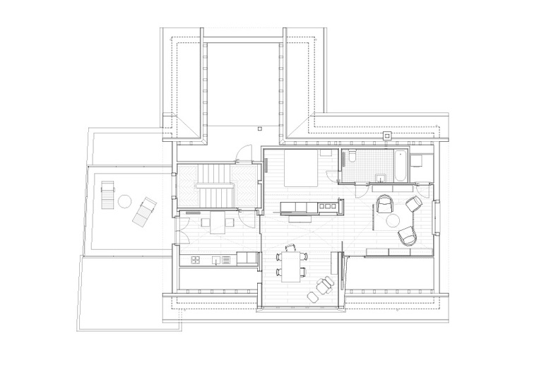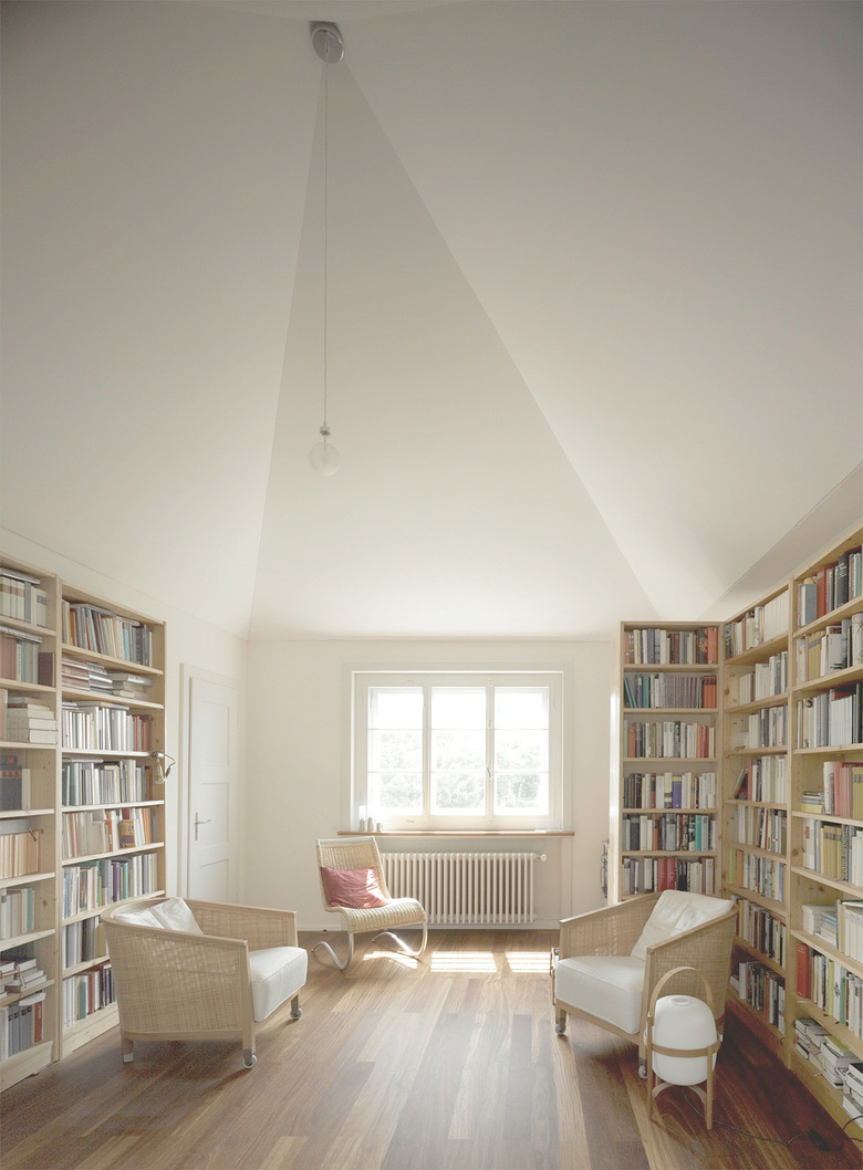 Im neuen Anbau befinden sich im Erdgeschoss zwei Schlafzimmer mit Bad und im Obergeschoss eine helle grosse Wohnküche mit vorgelagerter Terrasse. Das Dach wurde zu einer Dreizimmerwohnung mit Lukarne ausgebaut, die den Blick auf den See öffnet. Die Decken im Dachgeschoss, einzelne steil ansteigende, spitze Kuppeln, überhöhen die Räume und schaffen eine spezifische räumliche Situation.