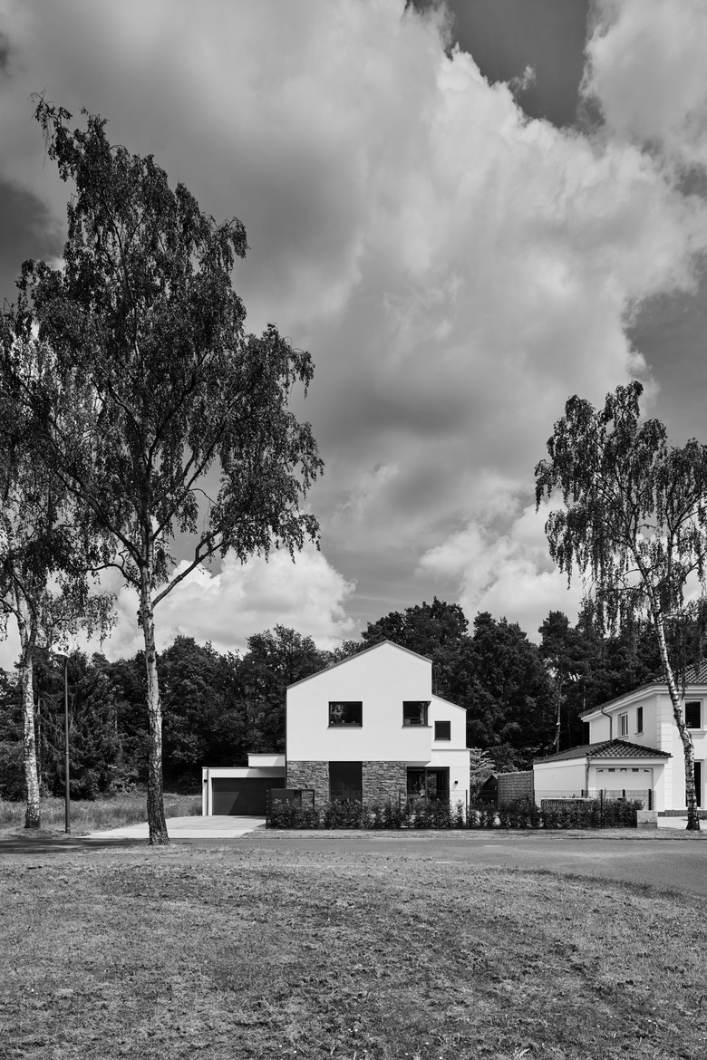 Das großzügige Grundstück bot sehr gute Voraussetzungen für die Realisierung des Einfamilienhauses. Richtung Osten, hinter dem Garten, schafft der Königsforst einen malerischen Hintergrund. Die Westseite ist mit einer unverbaubaren Grünfläche gesegnet. Dennoch bestand eine der Herausforderungen darin, einen Südgarten zu schaffen und somit möglichst viel Licht Innen und Außen zu erfahren.