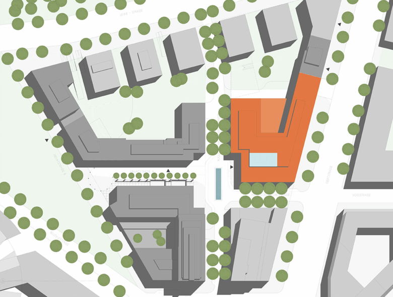 Das 5-Sterne-Hotel mit 380 Hotelzimmern adressiert mit seinem Haupteingang den neu entstehenden Stadtplatz. Die umlaufende Gebäudehöhe von 35 Metern bei 11 Geschossen korrespondiert mit den umgebenden Häusern am Platz.