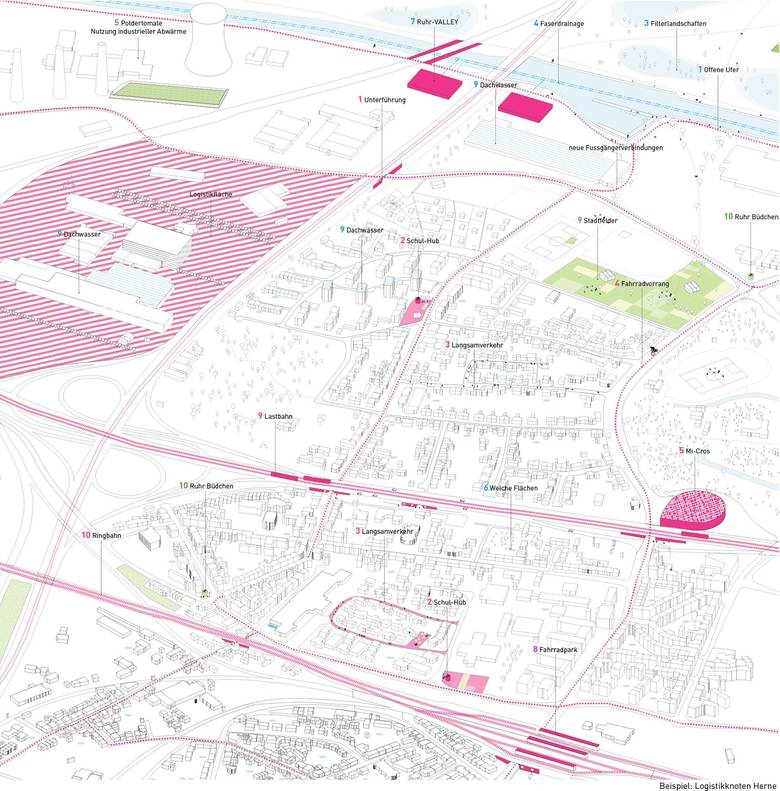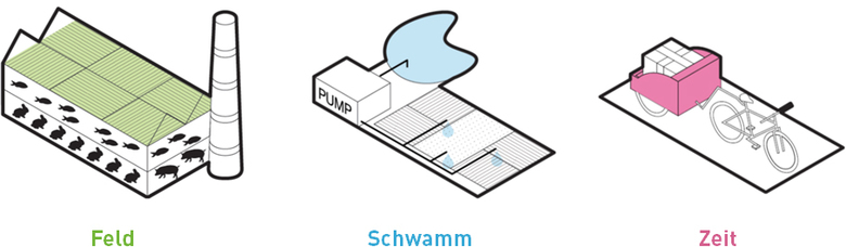 Die Schwammstadt steht für einen produktiven Umgang mit der Ressource Wasser. Die Ökonomie des Teilens verbindet die Themenstädte.