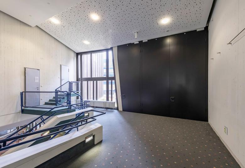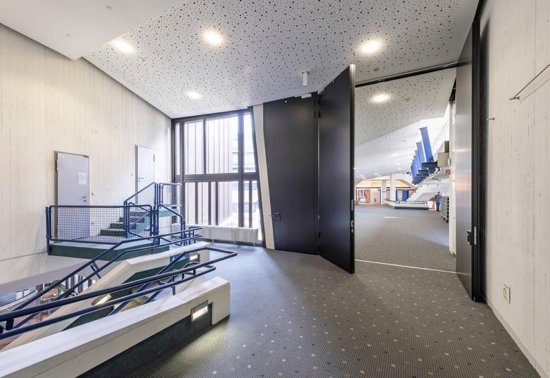 Diese Anforderungen erfüllt ein 3-flügliges Brandschutztürelement mit Offenhaltung, für das, auf Grund seiner Abmessung von 4,50x4,50m, eine Zulassung im Einzelfall erforderlich war. Die Lackierung der gesamten Türkonstruktion mit verdeckten Türmuscheln im Farbton schwarzbraun nimmt die Charakteristik der Architektursprache auf.
