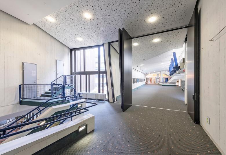 Die Herausforderung war dabei, neben der Realisierung in einem der hochfrequentierten öffentlichen Bereiche des Funkhauses, einen Raumabschluss in einem polygonalen Raum in zwei unterschiedlichen Bauteilen mit einem Brandschutztürelement gestalterisch so in den Bestand zu integrieren, dass in geöffnetem Zustand, sowohl die bestehende und auch weiterhin gewünschte Transparenz auf der Galerieebene zwischen Altbau und Neubau gewährleistet wird, als auch im Brandfall ein vollständiger Verschluss der Öffnung erfolgt.
