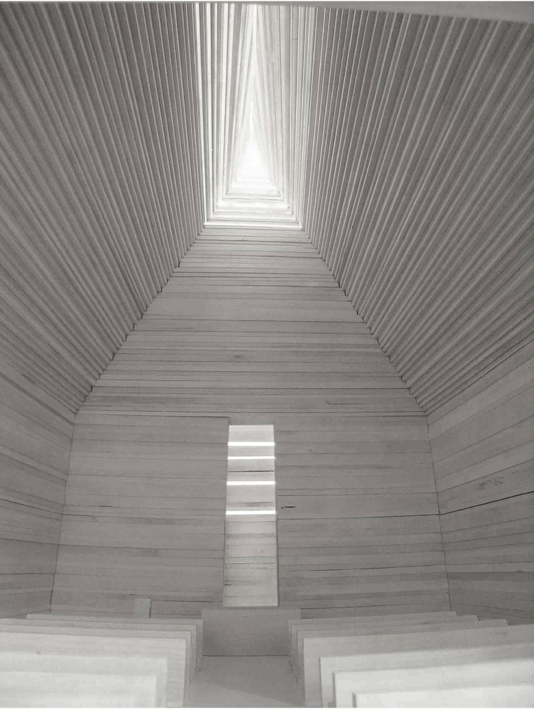 Das Herz des neuen Johannisthals ist die Kapelle – gebaut aus Granit mit einem überraschend weichen, warmen hölzernen Kern. Ihre Form, eine Reminiszenz an das einfache, traditionelle Haus. Innen und außen. Ein Spiel aus Licht und Schatten. Ein Gefühl wie in einem Wald bei Sonnenschein. Das Fenster – eine Leiter zum Himmel – reflektiert das Wasser der Waldnaab. Die in den Innenraum integrierte Orgel bringt den ganzen Raum zum Klingen – die ganze Kirche als Intrument. Die liturgischen Gegenstände aus der alten Kapelle finden sich in neuem Kleid aus verwittertem Stahl wieder in der neuen Kapelle. Die Materialien sind die gleichen wie immer schon. Granit aus Flossenbürg, Glas und Holz von Nadelbäumen.