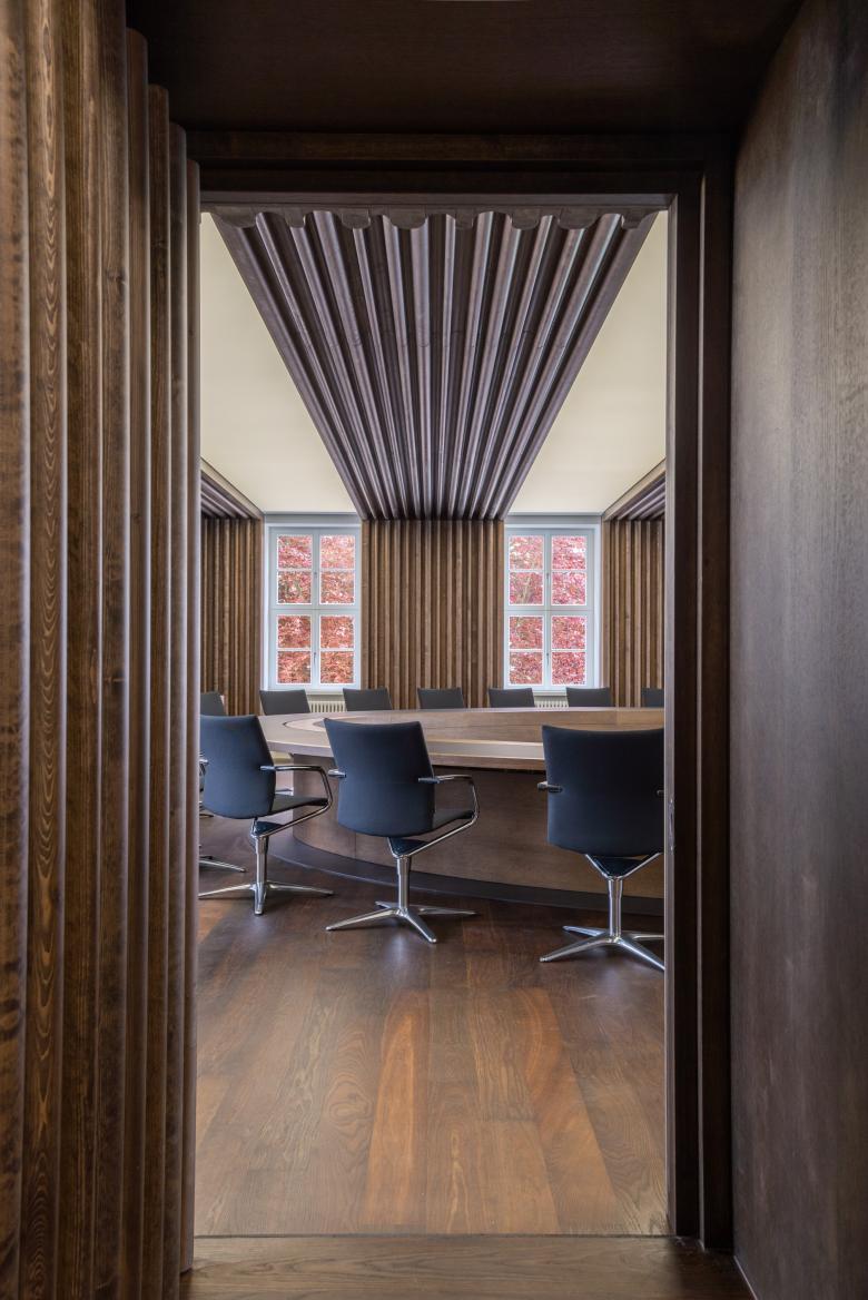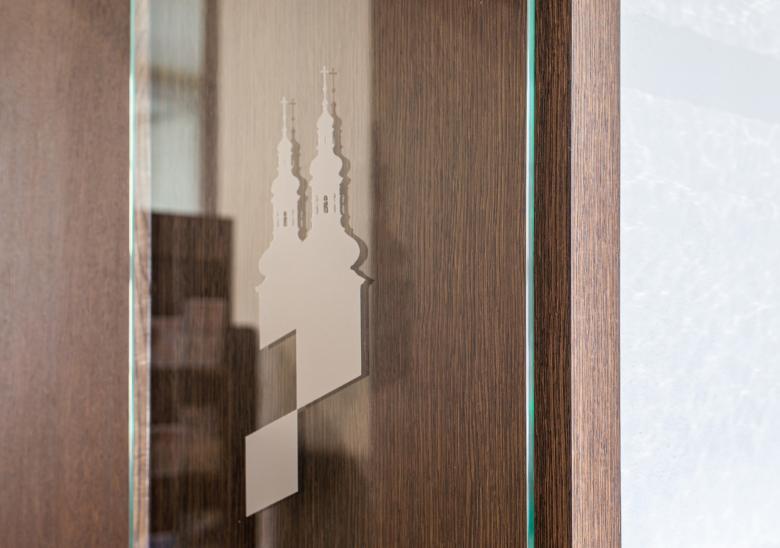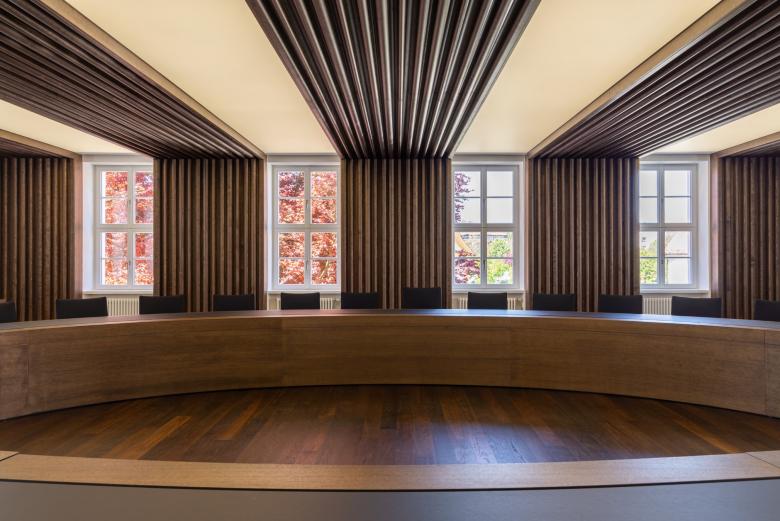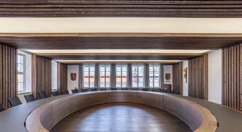 Innen ein multifunktionaler »Marktplatz«, ein Ort der Begegnung und des Empfangs mit hoher Aufenthaltsqualität und Ausblick auf die Basilika. Bei Tag und bei Nacht. Ein Katalysator für das ganze Haus. An der Stirnseite ein großer, vielfältig nutzbarer digitaler Screen. Rechter Hand befinden sich die Bürgerinfo und linker Hand die Touristinfo mit persönlichen Ansprechpartnern. Offene Türen, keine Schwellen, Zonen des Übergangs. Der neue Sitzungssaal – ein echter Sitzungssaal mit zeitgemäß interpretierten, handwerklich gefertigten, holzverkleideten Wänden, die an Vorhänge erinnern, wird von natürlichem und künstlichem Licht durchflutet. Ein großer, ellipsenförmiger, hölzerner Sitzungstisch mit integrierter Medientechnik ermöglicht modernstes Arbeiten.