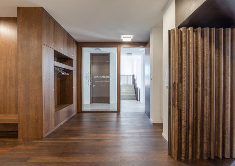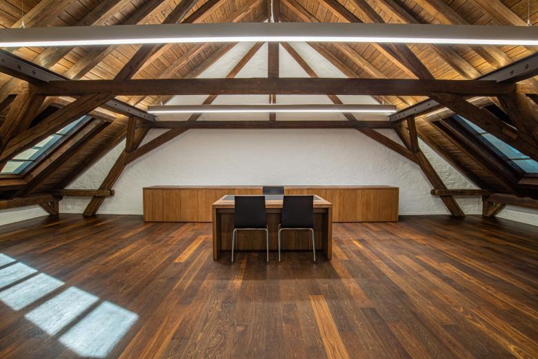 Die warme, hölzerne, handwerkliche Materialität und Farbigkeit im Inneren ist eine Reminiszenz an die Ausstattung der Jahrhundertwende: steinerne und hölzerne Böden, weiß gekalkte Wände, nach historischem Vorbild gebaute Fenster mit mundgeblasenen Isoliergläsern aus der Region. Man geht neue Wege, spürt jedoch die Geschichte. Der Dialog der Jahrhunderte setzt sich fort …
