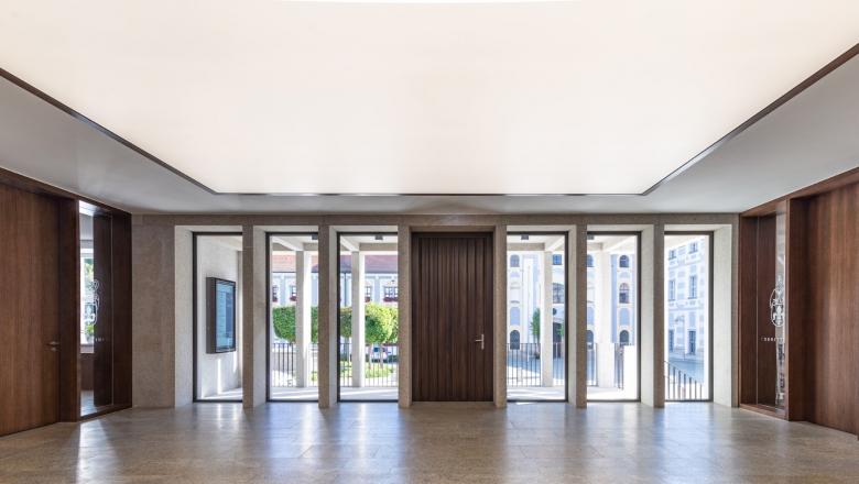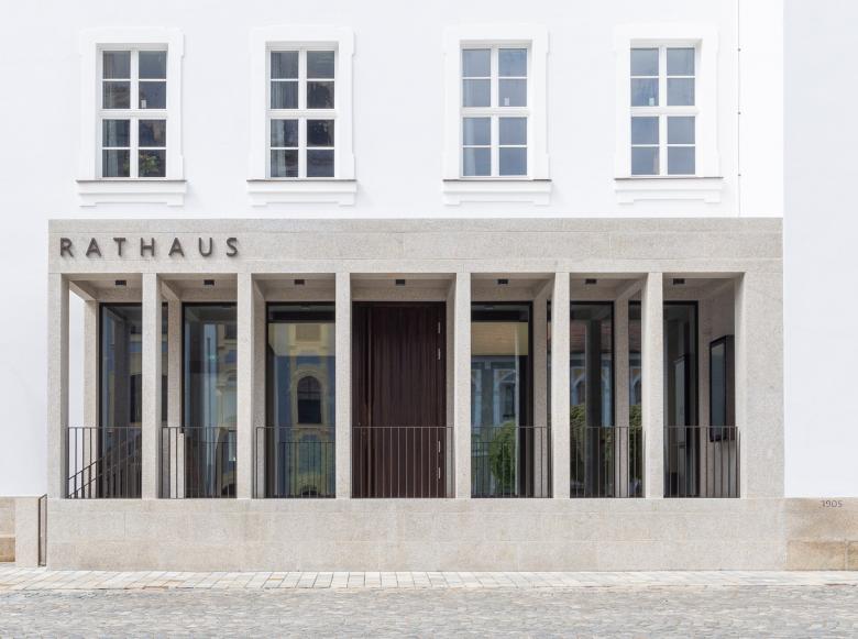 Im Dialog mit dem Bürgermeister und der Stadtverwaltung ist ein offenes und klar strukturiertes Haus für die Bürger entstanden, das die Menschen anzieht und Identität stiftet. Bürger, Mitarbeiter und Touristen betreten das Rathaus nun über einen »Stadtbalkon«, der steinern in den Dialog mit der barocken Basilika tritt. Dort können erste Informationen digital abgerufen werden – die schlanken Granitstützen und die gläserne Fassade erlauben Einblicke in das neue Foyer, machen neugierig, stiften Beziehungen zwischen der Stadt und dem Rathaus.