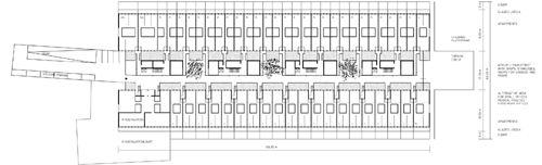 The FUL-HOUSE (Future Urban Live – House) project is a dwelling structure with 300 apartments, situated in the Viennese suburb of Simmering, a field of heterogeneous character, without any urban cohesion and without many public spaces and infrastructure. The flat area of Simmering with its green fields, with the extended glasshouses, and the factory chimneys in background, radiate a unique poetic impression. Here, as in many other periphery areas, the new build dwellings have no chance to be really urbanised in the next future. Our proposition for this place is a converse solution: CITY IN THE HOUSE. Outside remains the unchanged poetic landscape, inside, between two compressed, long-stretched residential blocks for the inhabitants arises the possibility to find public space, communication and urban comfort in their own house. This glass-covered middle zone, named Atrium or Main Street, contents different small shops, a kinder garden, small offices and cabinets for medical practices, places for seating and communication, depots for kinder prams and waste. The internal street is accessible only for cars of ambulance, waste transportation, stock supplies for the shops, and taxi-cars for handicapped people or fire brigade vehicles. Along the Atrium are situated also the four staircases and elevators.
