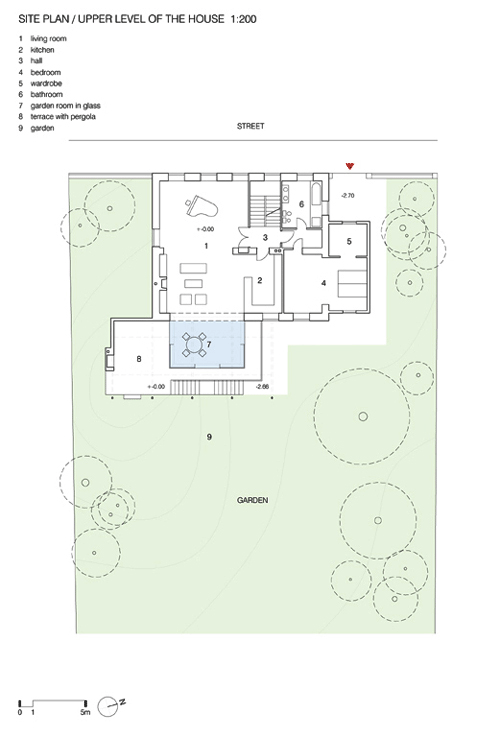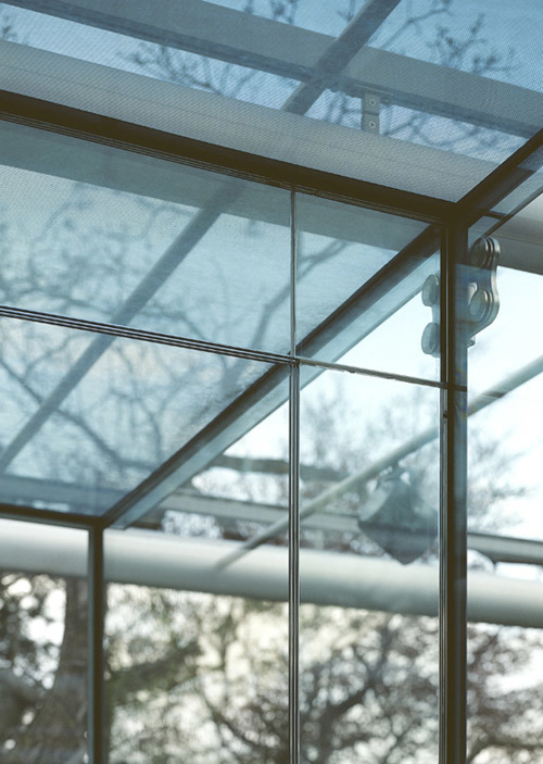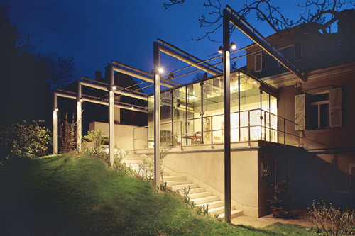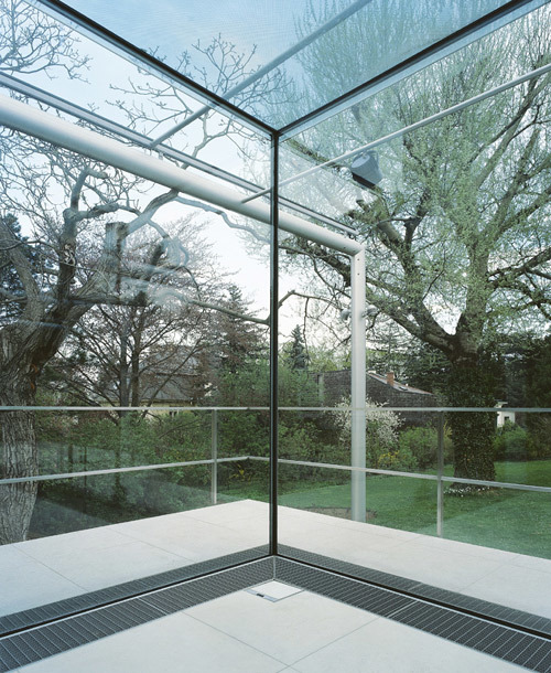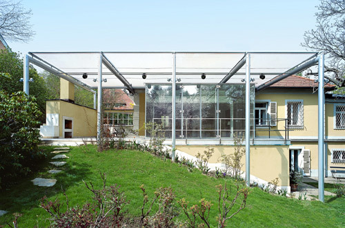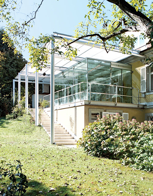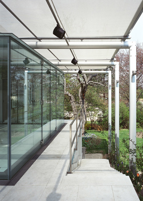 The pure cubic form and the transparent body of the new garden room grant it autonomy and allow its addition without conflict with the traditional architecture of the old house. A pergola of aluminum yacht masts was designed to support the movable sunscreens over the glass house, terrace and stairway and so manages to create blurred boundaries and a gradual passage between house and garden. The emerging chain of interwoven spaces, each closed and protected to a different degree (walled in living room, glazed garden room, the in-between space of the terrace under the pergola and the open garden) produce a multi-layered membrane space. The aim of this special set-up was to obtain a flowing passage to the exterior through climatically differentiated zones. The glazed garden room takes central position in the chain and belongs in equal grade as well to the house, as to the garden. It is a space integrator from the outside to the inside.
