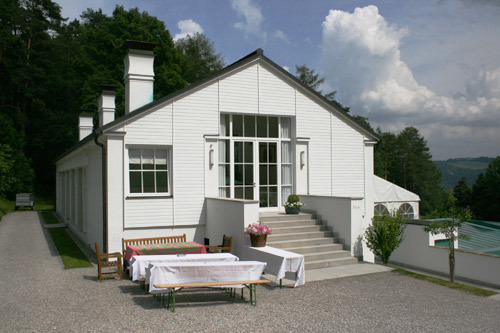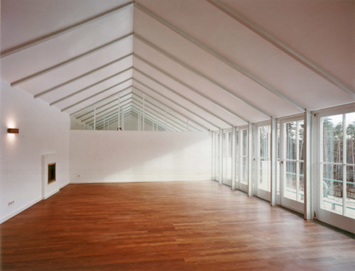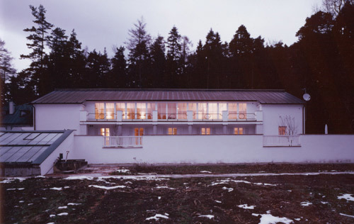 Originally the house was an out-building of the palatial Villa Kranz, built around 1908 by Oskar Strnad. The roof was made of glass and used äs a greenhouse for the cultivation of plants. Already before 1920 the glass was replaced by metal sheeting extending to the terrace banister. During reconstruction a wing was added on the east and west side and the whole building was adapted as a home. The roof was given a delicate steel structure with narrow rhythms to create an Impression of lightness and to establish a link to the former glasshouse. Light screen walls and Skylights on the upper floor accentuate continuity with the roof, as well as the transparency and the openness of the interior. In the north, a gallery was added in the high-ceilinged passageway.