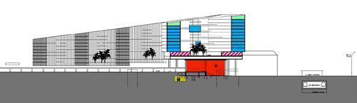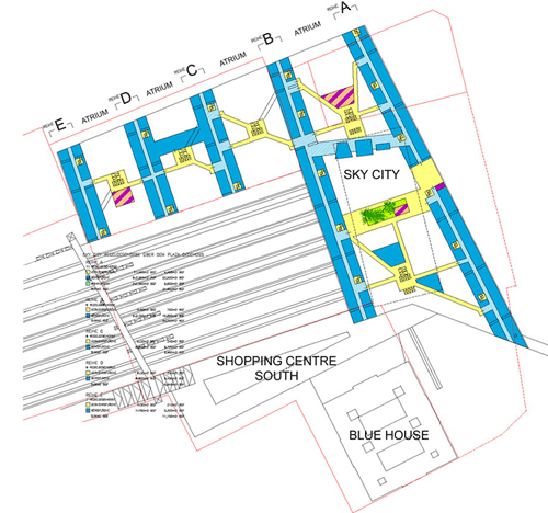 and a group of elevators and escalators, leading directly also to the garages in the ground.