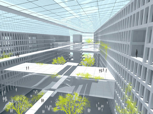 The SKY CITY is a `CITY IN THE HOUSE` project, an urban mixture of different functions in a huge public atrium-space, the GREEN PLAZA.