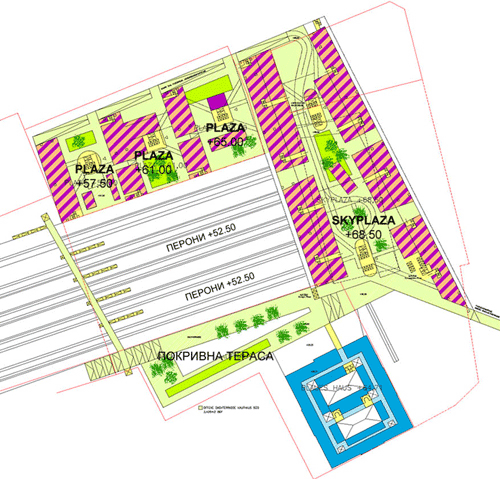 The different terraces of the plaza are connected to the ground by a ramp on the north side offering entrance for taxis, fire brigade and ambulance cars. The space in between the 5 blocks can be used for pavilions of different size erected time by time.