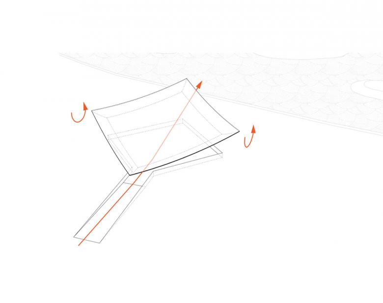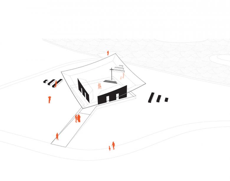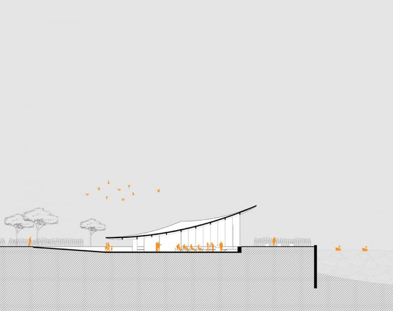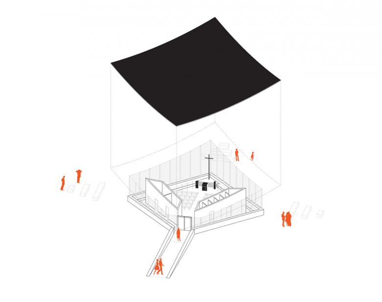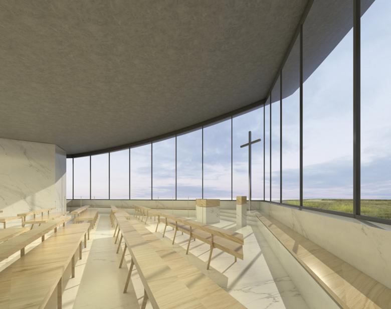 Die Hochzeitskapelle ist leicht versenkt und von einem geschwungenen Dach bedekt, um eine stärkere Zäsur zwischen Innen und Außen in dem rundum verglasten Gebäude zu schaffen. Der Altar ist dem Wasser zugewandt, so dass das Paar und der Priester vom verglasten Gebäude und dem See im Hintergrund umrahmt werden.