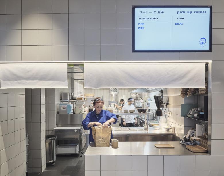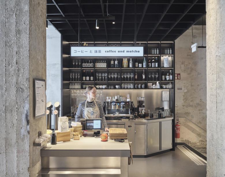 In this sense, the stations – each with their individual look – symbolize the variety of Tokyo’s shopfronts: Coffee & Matcha bar, take-away counter and shop area all function independently and at the same time, define the venue’s spatial situation. Guests are guided by branded signage that mirrors Tokyo’s characteristic abundance of colorful advertising sings.
