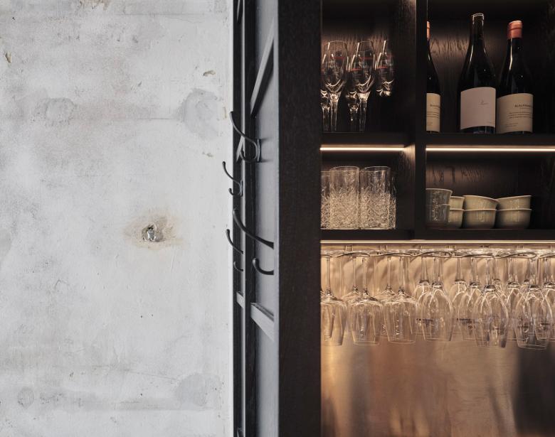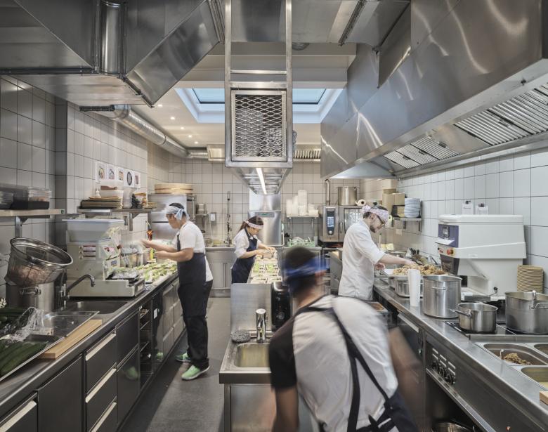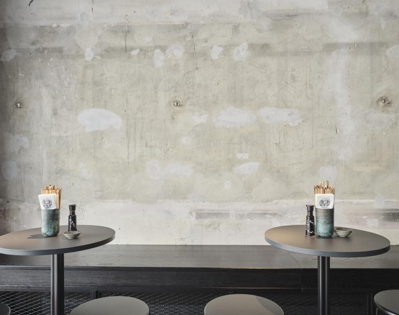 A strict grid – the epitome of harmony and modular construction in Japanese architecture – determines the main design elements: square tiles framing the cubic kitchen area pick up the pattern on a smaller scale, so do the grid-like shelves made of black oak that present Japanese produce, recipe books and table ware. Guests who wish to linger around are invited to enjoy their freshly prepared dishes on a community table placed in the centre of the venue. Itadakimasu!