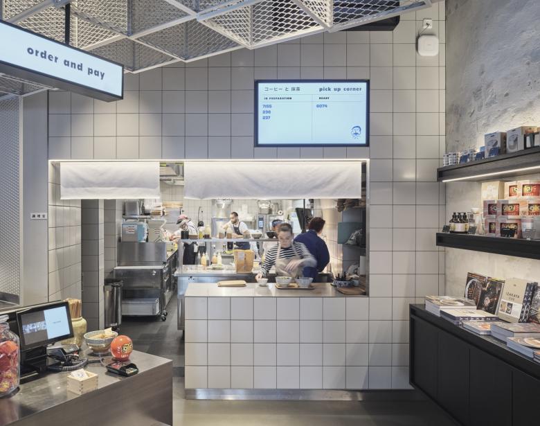 Inspired by the hustle and bustle of the vibrant metropolis, the interior design by BÜRO KLK refers to the idea of a flow of people pushing through narrow streets – flanked by neon signs advertising all kinds of goods. The concept for o.m.k. 1010 has been translated into an object-like spatial design that comprises both Dine-In and Take-Out options as well as a store for Japanese cooking essentials.