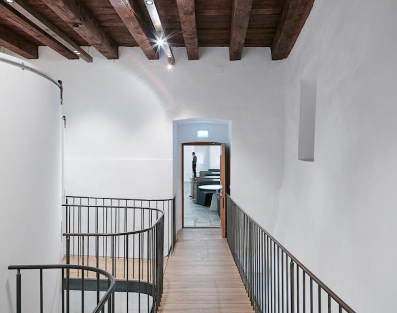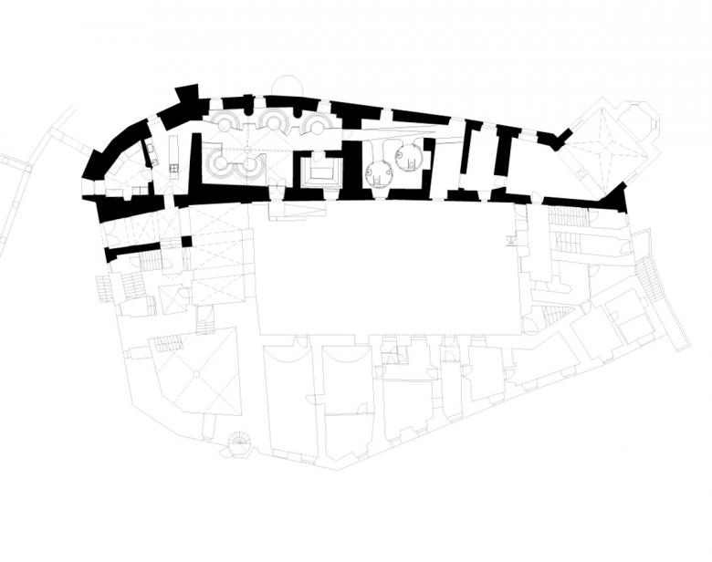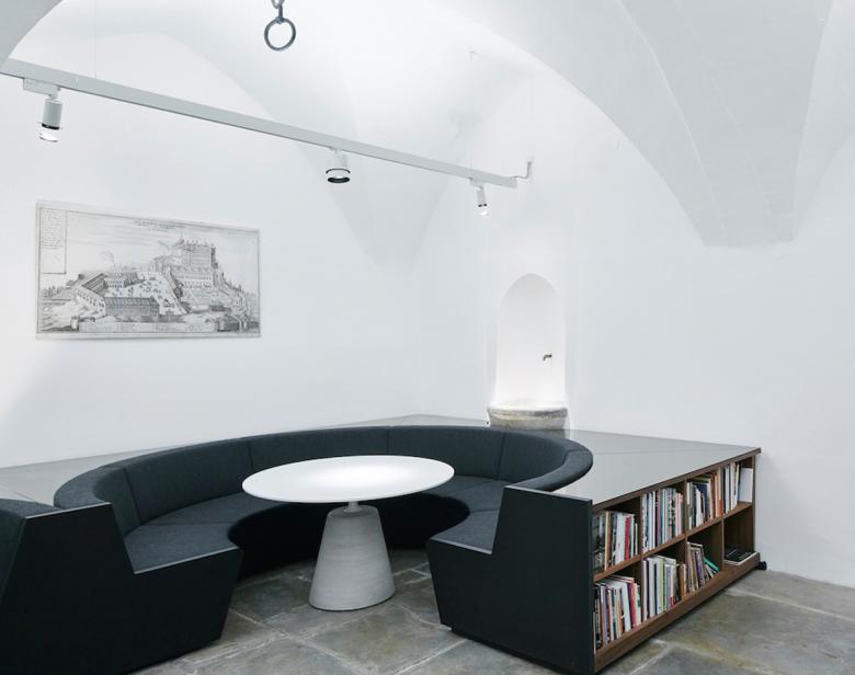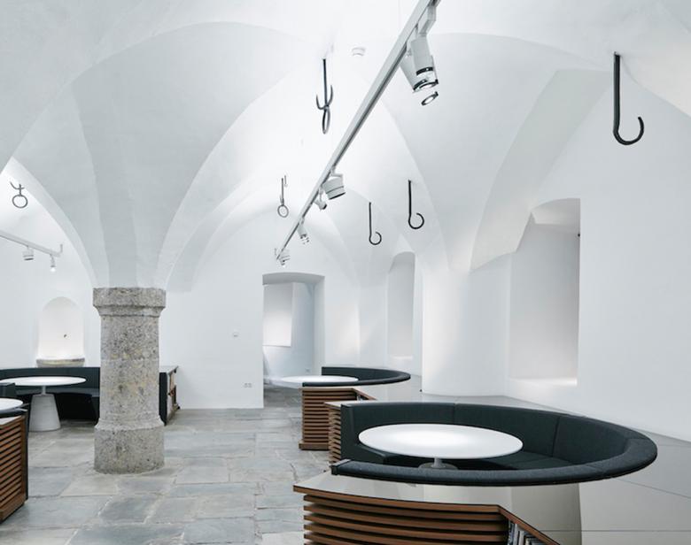 Unter Berücksichtigung des besonderen Baudenkmals und der speziellen Begebenheiten auf Schloss Ambras Innsbruck wurde ein minimalistischer und behutsamer Umbau der gotischen Gewölberäume umgesetzt. Der konzeptionelle Entwurf greift eines der wichtigsten Elemente der Renaissance, den Kreis, auf. Flache, radiale Sitzbankmöbel im Gastraum nehmen sämtliche technische Einbauten auf und reflektieren mit broncierten Spiegelflächen die beeindruckenden gotischen Spitzbögen. Die Planungen erfolgten im Auftrag des Kunsthistorischen Museumsverbandes Wien.