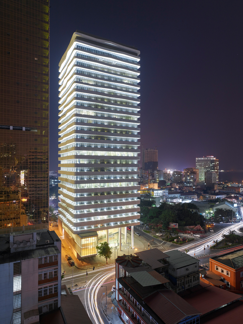 The 1º Congresso Tower assumes a prominent role in the fabric of central Luanda overlooking Largo Lumeji square, revealing a suave and reserved formal dynamism that nevertheless leaves a striking image on the urban identity.