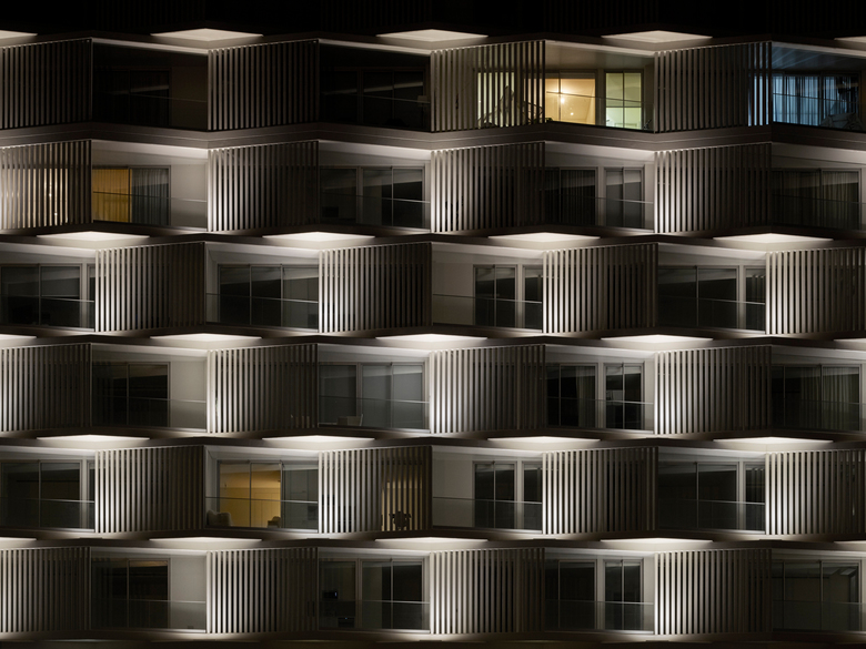 In the design of the building, which has 1 office floor and 7 residential floors, the assymetry of the façade planes together with the somewhat angular windows make for an expressive corpus that can be likened to a huge music staff. Over the course of the day, the sunlight creates and recreates a multiplicity of games of light and shade, bringing to life this great partiture that presents variations of scales, metre signatures, interruptions and silences.