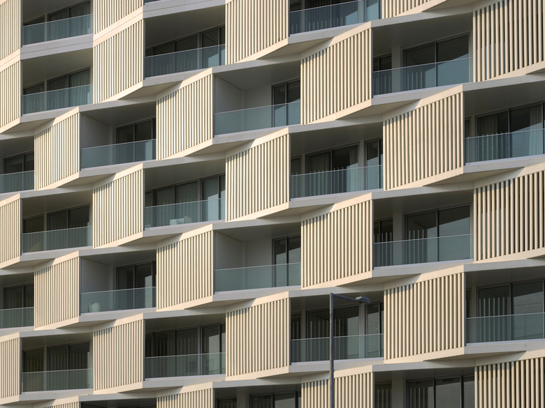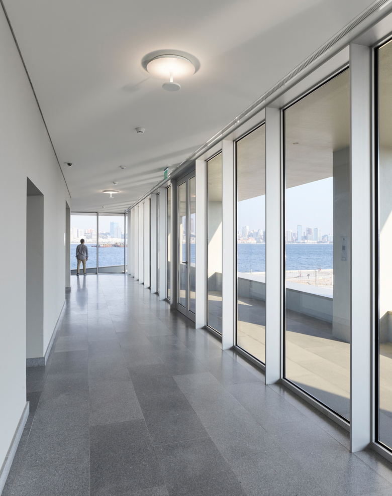 In the interior (which provides space for 28 apartments, each with either 2 or 3 aspects) one finds a refined narrative in the form of ample multiplication of visual perspectives over the horseshoe of the bay coastline and the city skyline.