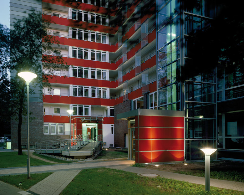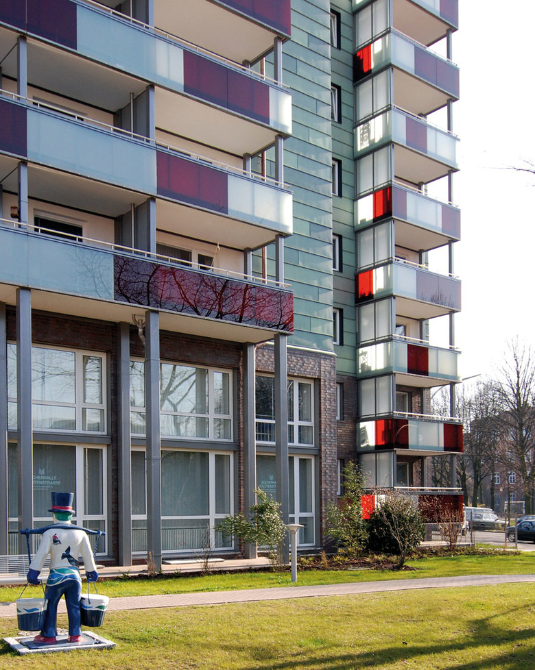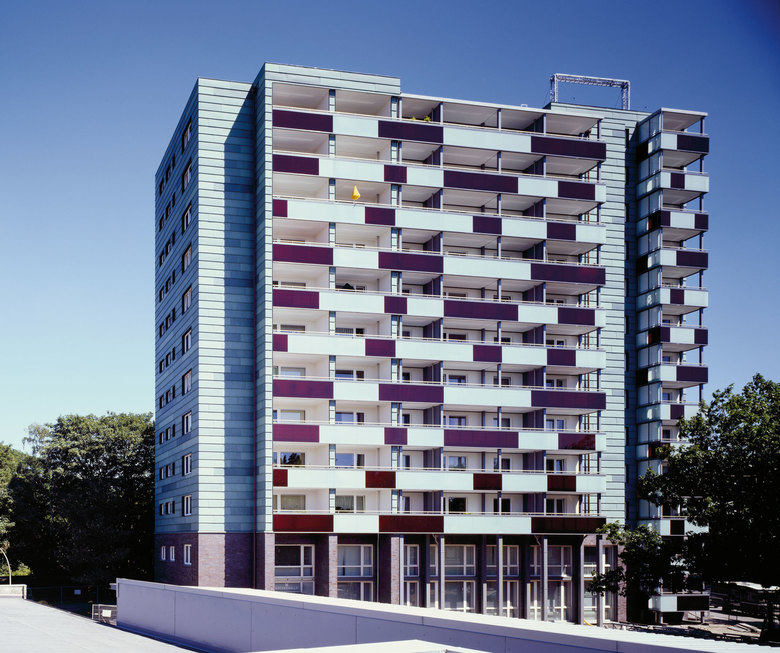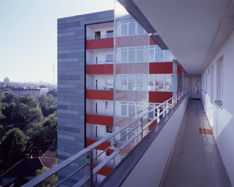 Die komplette Überformung und energetische Modernisierung erfolgte im bewohnten Zustand und umfasste die gesamte Gebäudehülle, die Bäder und Küchen, einschließlich der Lüftungsanlage, sowie die Erschließung und die Außenanlagen. Neben den funktionalen und technischen Notwendigkeiten galt es vor allem, dem Gebäude eine nachhaltige Attraktivität und Harmonie zu verleihen, so dass Betrachter und Bewohner ausschließlich Vorderseiten wahrnehmen und angenehm berührt werden. Die durablen Fassaden aus Verblendmauerwerk und vorpatinierten Kupferfalztafeln, vorgehängt und hinterlüftet, verleihen dem Gebäude einen neuen, individuellen Charakter und prägen im Zusammenhang mit dem Farbspiel der Glaselemente die unverwechselbare Architektur. Auf einer neuen Tiefgründung vorgelagerte Balkon-Loggien erhöhen den Wohnwert ebenso wie die jetzt großzügige, barrierefreie Erschließung und der vor die Laubengänge gestellte gläserne Panorama-Aufzug. Entstanden ist ein weithin sichtbarer Solitär mit Strahlkraft und positiver Energie für das Quartier und darüber hinaus. Das Projekt wurde als besonders hervorragende Lösung dieser an vielen Orten anstehenden Aufgabe in den Architekturführer 2010 für Stadtentwicklung und Denkmalschutz der Hansestadt Hamburg aufgenommen.