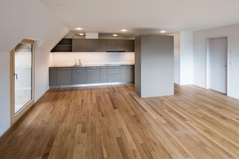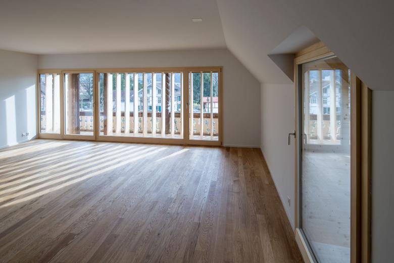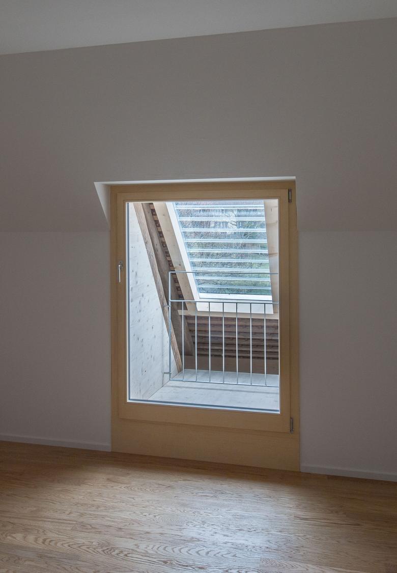 Der Wohnteil wurde um die zweigeschossige Tenndurchfahrt (zwischen Wohn- und Ökonomieteil) und um ein Geschoss in den Dachraum erweitert. In der Tenndurchfahrt wurde eine zusätzliche Geschossdecke sowie das neue Haupttreppenhaus eingebaut. Erd- und Obergeschoss bilden eine grosse Maisonettwohnung mit einer eigene Treppenverbindung. Die beiden Maisonettgeschosse können bei Bedarf mit wenigen Eingriffen in zwei unabhängige Geschosswohnungen umgebaut werden. Im neu ausgebauten Dachraum entstand eine 4.5 Zimmerwohnung.