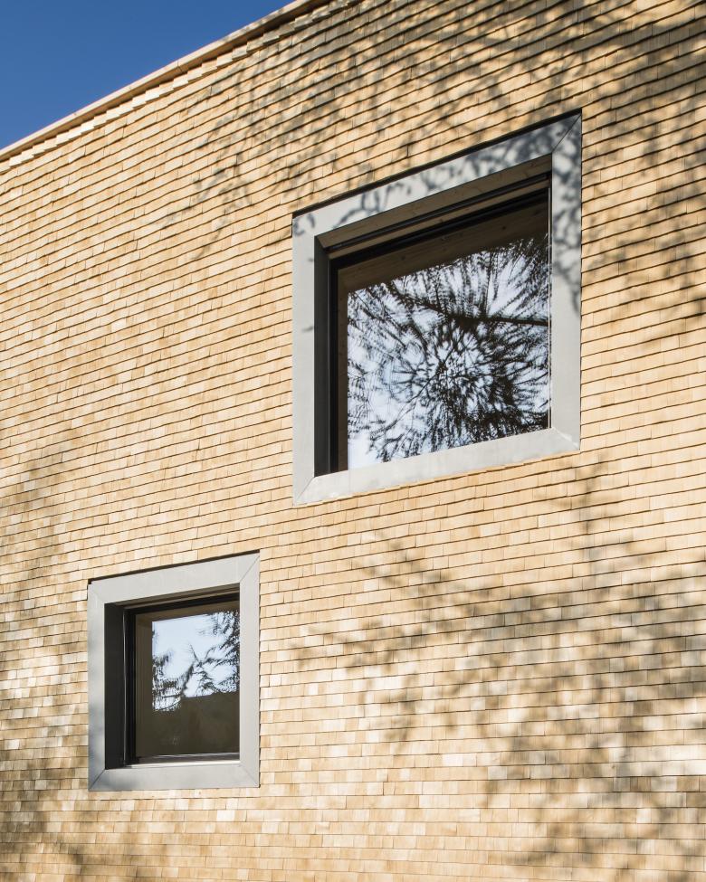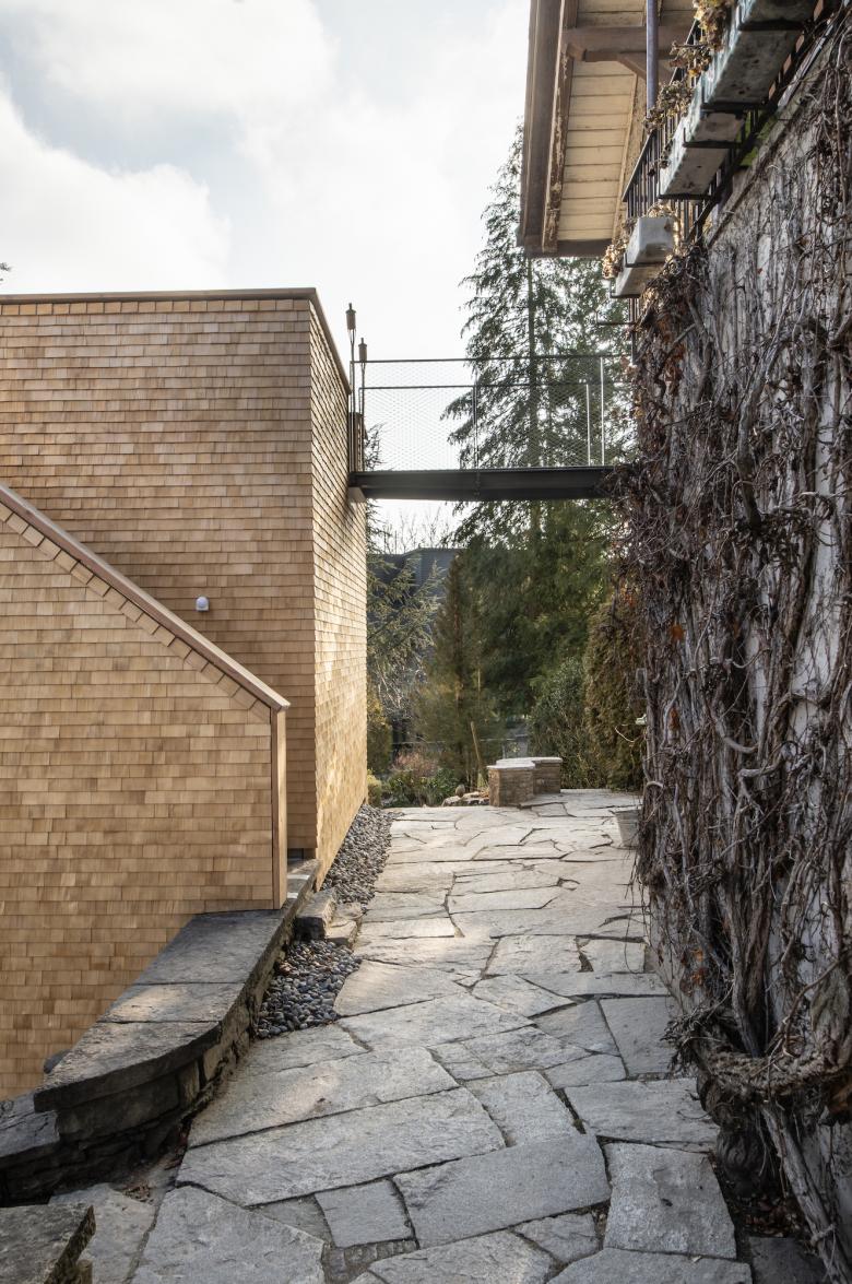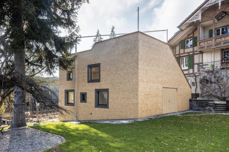 Der Baukörper wurde auf dem Fussabdruck des ehemaligen Treibhauses der Gärtnerei aufgebaut. Mit dem bildhauerisch modulierten Volumen wird subtil auf das bestehende Gebäude sowie den gewachsenen Terrainverlauf reagiert. Die schlichte Holzschindelverkleidung sowie das Öffnungsverhalten ist eine zeitgemässe Referenz an den Schweizer Holzstil des bestehenden Gebäudes. Eine minimalistisch ausformulierte Stahlbrücke verknüpft die Dachterrasse mit der bestehenden Obergeschosswohung.
