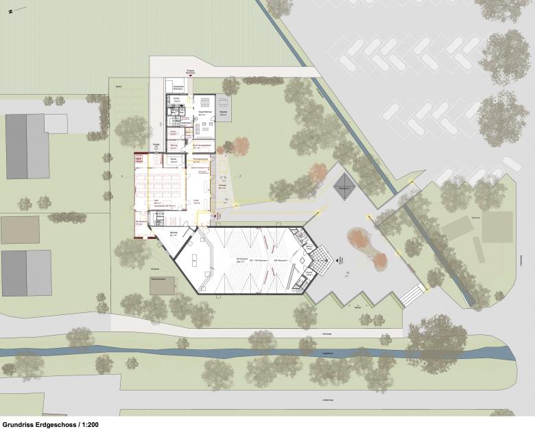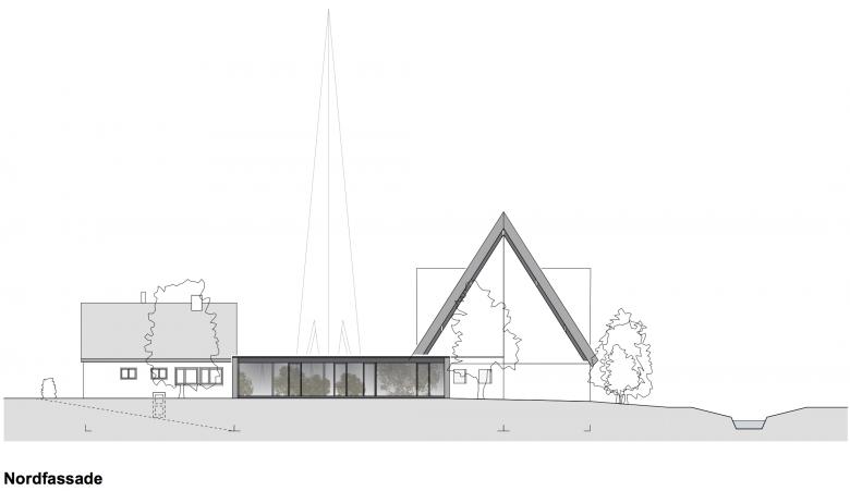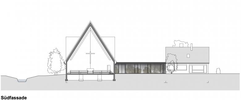 Unser Projektbeitrag sieht einen zurückhaltenden Neubau zwischen dem Kirchenschiff und dem Pfarrhaus vor.