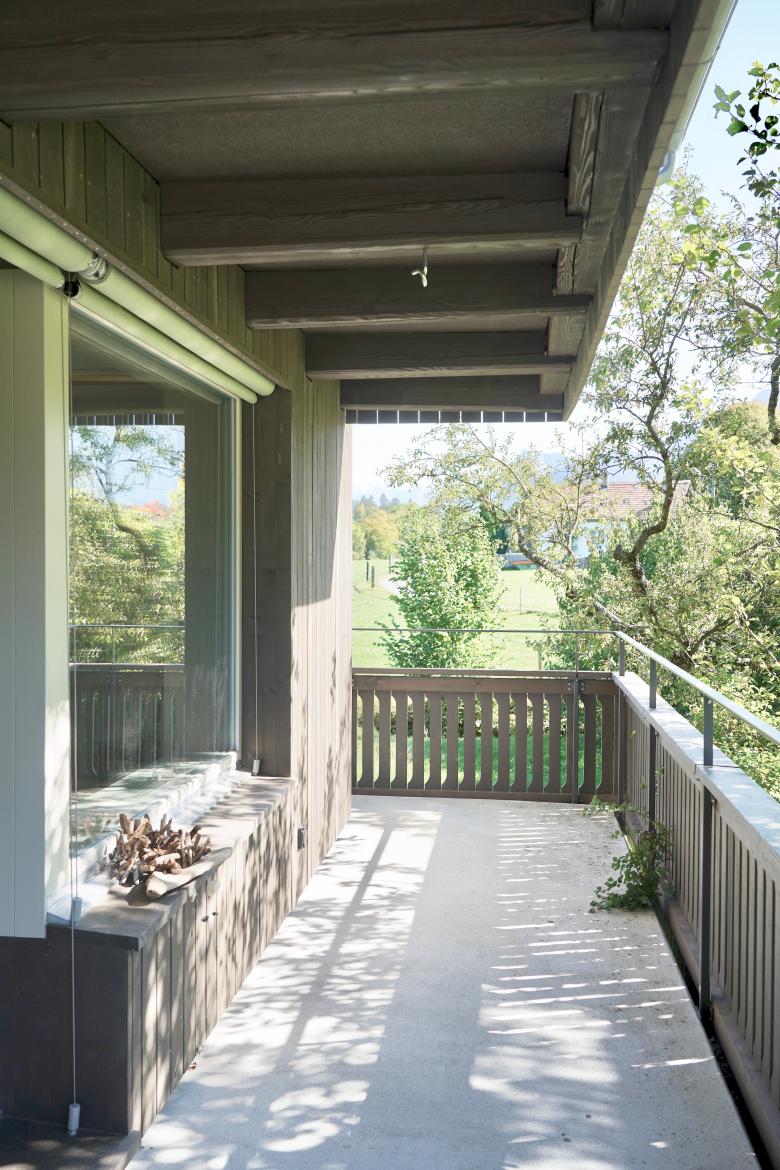 Der bestehende Hybridbau wurde zu einem ruhigen und einheitlichen Holzgebäude umgestaltet. Die Materialisierung referenziert mit der örtlichen Bauweise. Der umlaufende Graben wurde mehrheitlich aufgeschüttet und eine räumliche Verbindung zwischen Wohngeschoss und den Umgebungsflächen geschaffen.