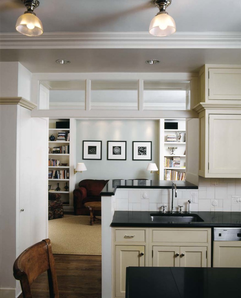 A seldom used formal Dining Room was converted to a Family Room. A large opening to the kitchen further integrated this redefined Family Room, framed along the top in Clerestory Glass. A Media Cabinet was placed behind the sink and facing the Family Room, enhances the intimate relationship between the two spaces. A dining table, which opens up into a 10 seater, was placed in the Kitchen. A removable center island was designed to be on castors for easy relocation. The Kitchen is designed with milk paint cabinets from Crown Point. Black granite is used for the Kitchen counter tops. 3-D tiles from County Floors were used as accent points along the Kitchen back splash of the kitchen range and sink.