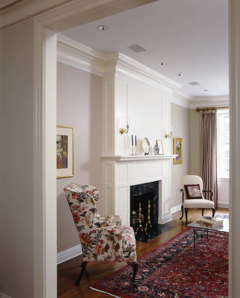 In the Living Room a new wooden Mantle was constructed, extending to the ceiling, and enhances the room’s monumentality.