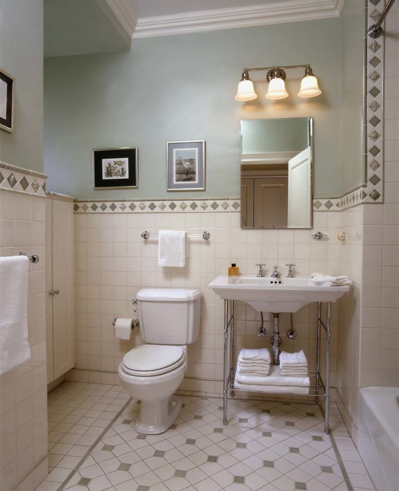 Master Bathroom Slabs of limestone are used for the tub, floor, and vanity, with mahogany wood. A custom designed mirror and sink vanity showcases the British fittings of Czech & Speake, which are used also for the bath. In the Second Bathroom seashell with that ban wainscot tile in aqua and greens reflect a nautical theme.